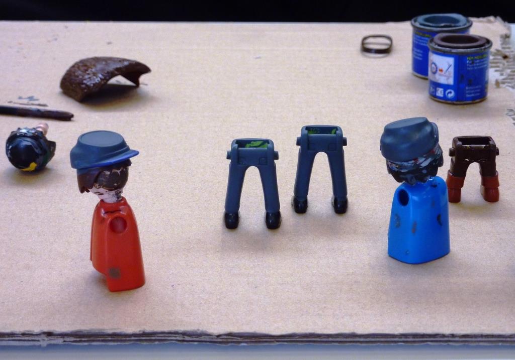 Hier wird Fleissig gemalt: Eine Schritt für Schritt Demo von der Arbeit mit Isolierband und Aufklebern... ... zur fertigen Figur mit geschnürtem Hemd und StreifenhoseBitte die Fotos anklicken. Sie werden größer und die Details sind viel besser zu sehen.