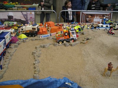 Das Diorama beeindruckt mich durch seine Details. Der Motorradfahrer, der hinten auf dem LkW das Etappenziel erreichend; die Mechaniker schraubend an den Fahrzeugen; die Wüste mit ihrer angedeuteten Größe und Leere und natürlich die Einheimischen. Der Kontrast zwischen den gedeckten lokalen Farben und dem quietschig bunten Rennzirkus erinnert mich an die abendliche Zusammenfassung des jeweiligen Renntags auf Eurosport. Und ich meine die richtige Rallye PARIS – DAKAR, nicht den Abklatsch in Südamerika.