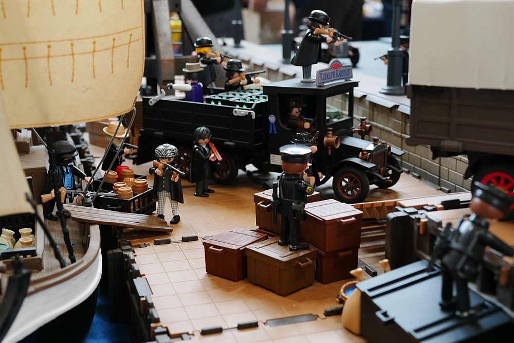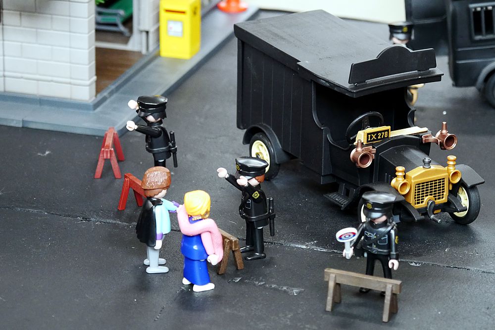 Super viele Details und geile Customs. Besonders die Polizei Fahrzeuge finde ich extrem gelungen .... Und das vermutlich erste Gefecht auf einer Ausstellung mit original Playmo Tommy Guns