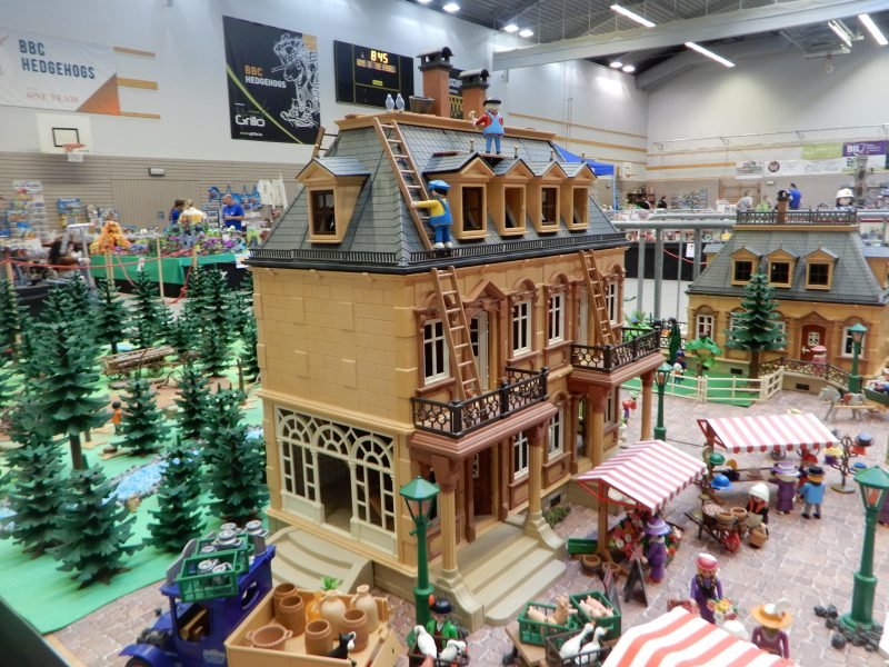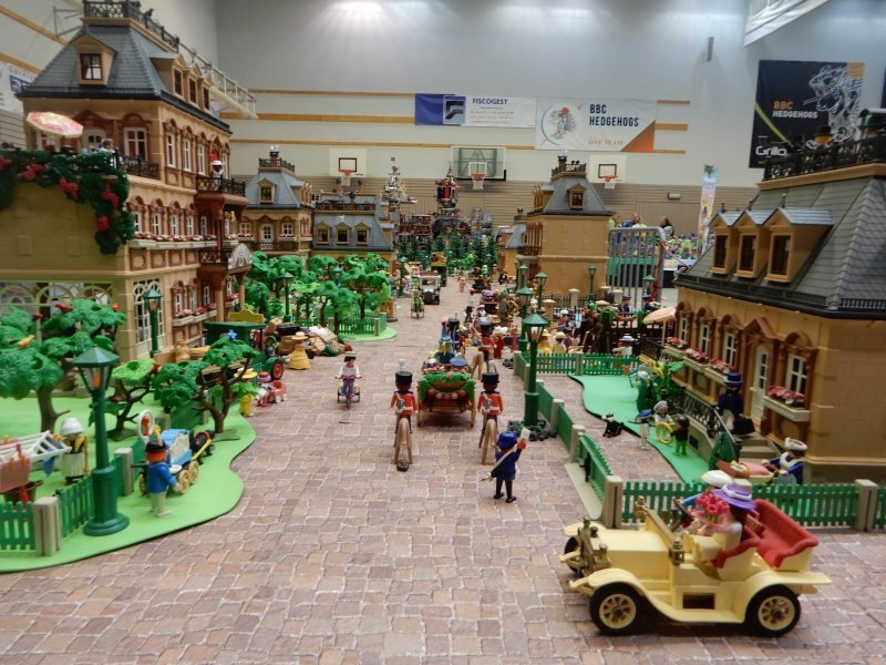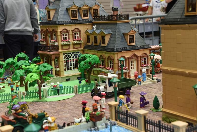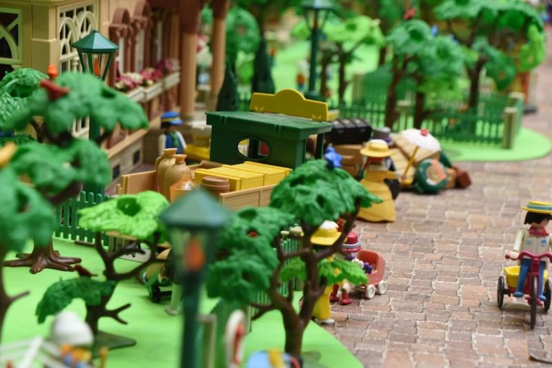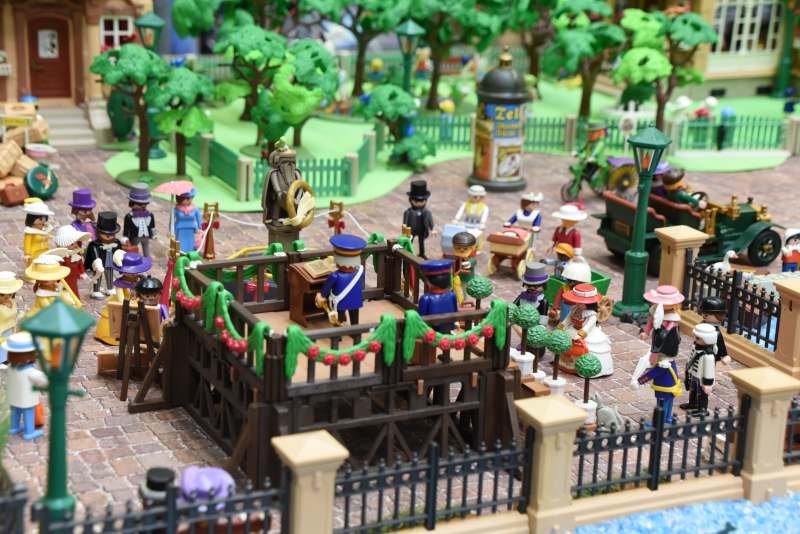 Ein 1900 Diorama mit vielen der schönen, alten Häuser, viel Leben auf der Straße und einem Wald.
