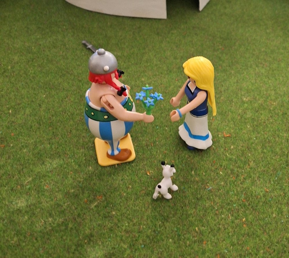 Vorher fragt er noch seinen Freund Asterix, der ihm rät, doch Blumen zu pflücken, um Falbala diese zu überreichen.