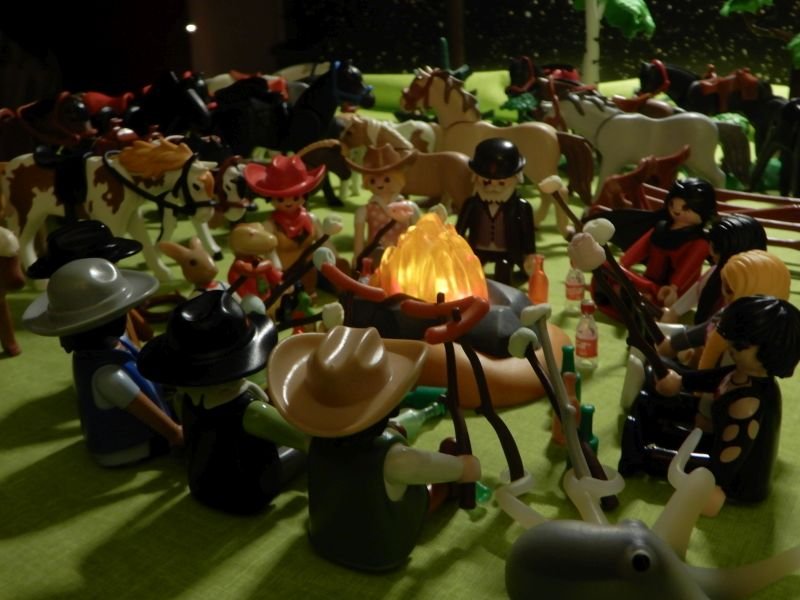 Nach einem anstrengenden Tag auf den Pferden machen wir Rast. Die Cowboys fachen ein großes Feuer an. Es gibt Bohnen und als Nachspeise Marshmallows…
