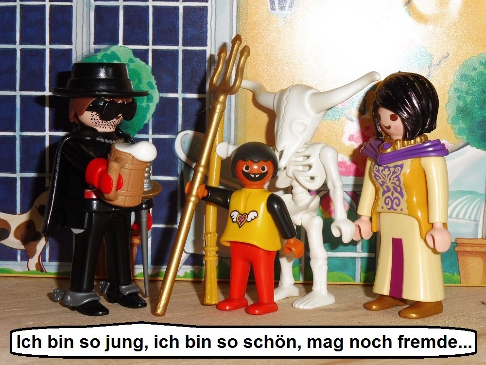 Die Jungfrau: "Ich bin so jung, ich bin so schön. Will noch keine fremden Länder seh´n. Will Lebensglück in Männerarmen. Ach Mr. Todt, hab doch Erbarmen.