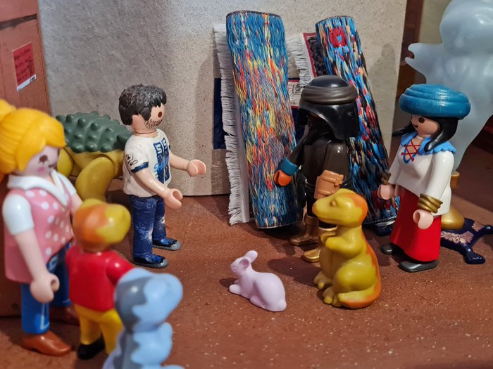 erschien zweimal Knüpfware, zusammengerollt hochkant an die Wand gelehnt.