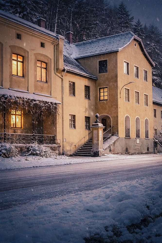Föd 4: 26. Dezember – 2. Weihnachtsfeiertag. "Wir treffen uns mit jemandem", sagt Oma Maria. Wir fahren auf den Sonntagsberg. Die Basilika sieht man schon von weitem. Aber Oma Maria geht nicht auf sie zu. Sie geht an ihr vorbei. Ein zweites Gebäude steht dort: 𝖁𝖊𝖗 𝕾𝖆𝖈𝖗𝖚𝖒. Heiliger Frühling. Es wirkt wie eine Mischung aus Kapelle und Brunnenhaus.