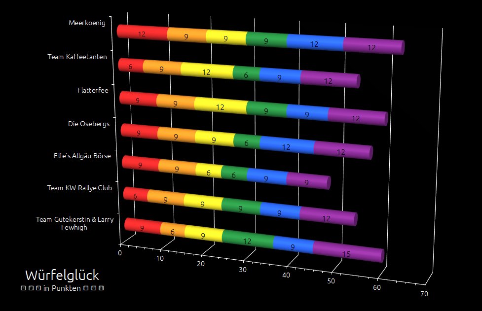 Das Team Gutekerstin & Larry Fewhigh erreicht das Ziel mit 1x Würfeln + 2 Anstoßer. 15 Punkte. Hart!