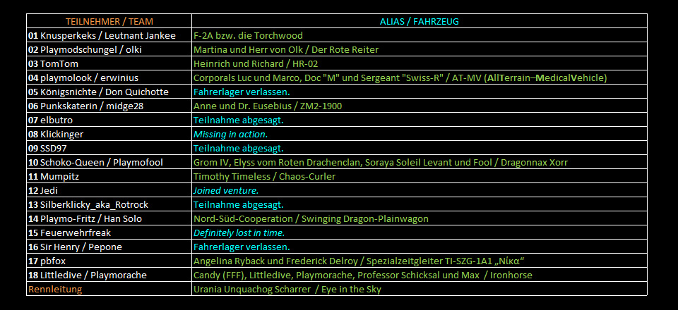 Bedanken möchte ich mich auch bei allen Teilnehmern, es war echt lustig, mit Euch zu spielen!