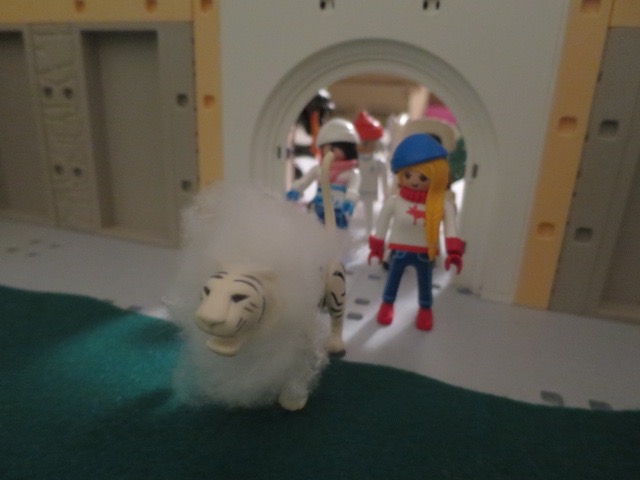 Kaum hat der Professor die Worte ausgesprochen, steht die Truppe vor einem grossen Tor mit einem weissen Löwen davor. Auch der Sturm und Schnee hat plötzlich aufgehört.