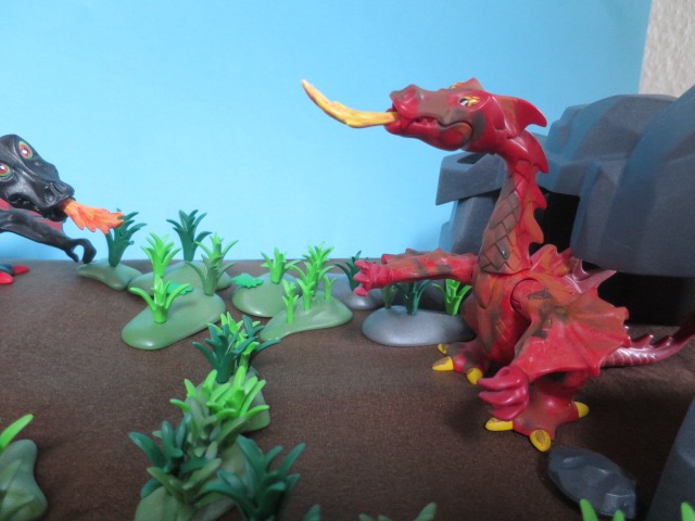 Ah, dort ist ja schon seine Höhle." sagt der Drache und zeigt auf eine nahe gelegene Höhle. Aus der Höhle tritt ein mit Schlamm bedeckter Drache heraus.