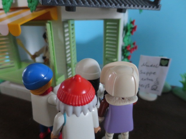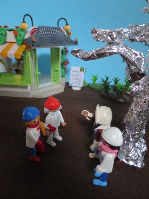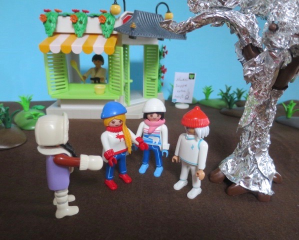 "Wäre schön, wenn jetzt eine heisse Suppe in die Schalen fliessen würde. Damit ich wieder warm werde." unterbricht Luzia den Monolog. "Ist doch gar kein Problem. Hier neben dem Tempel hat es eine Suppenküche. Lasst uns dort reingehen und uns aufwärmen." schlägt Qvpetra vor.
