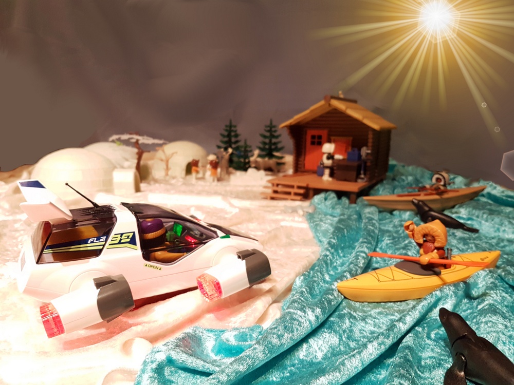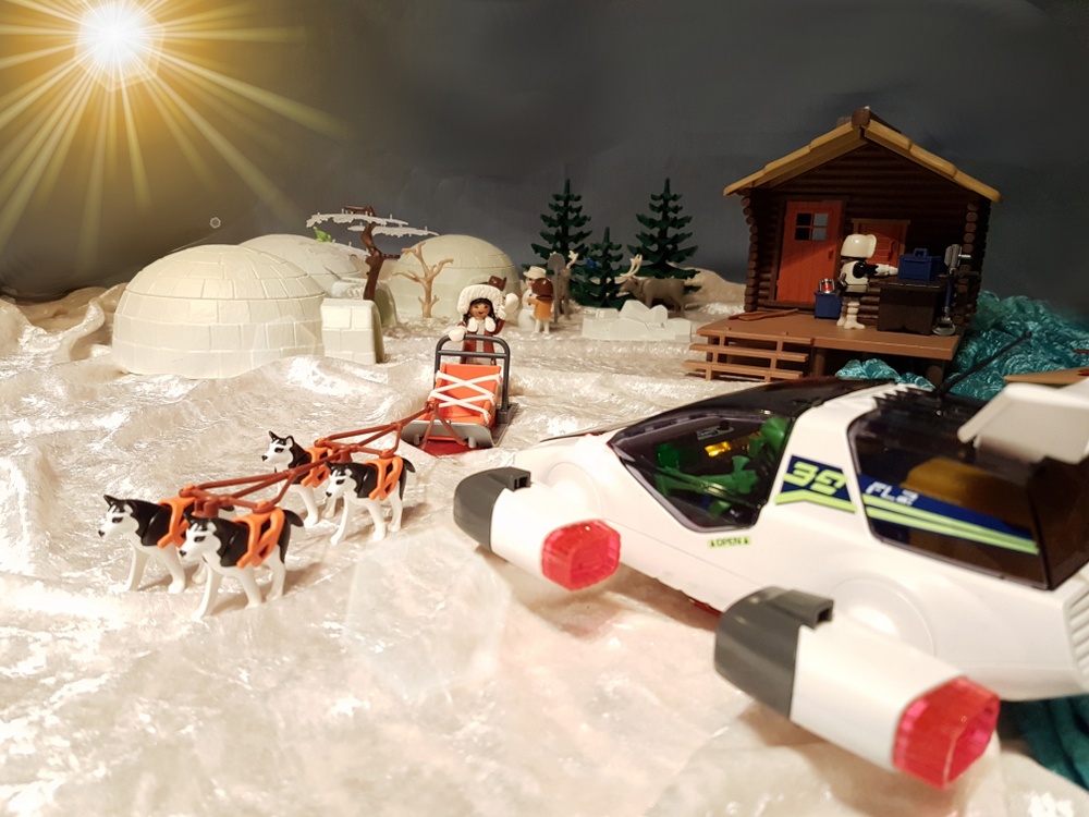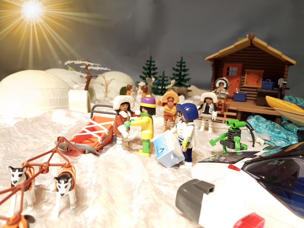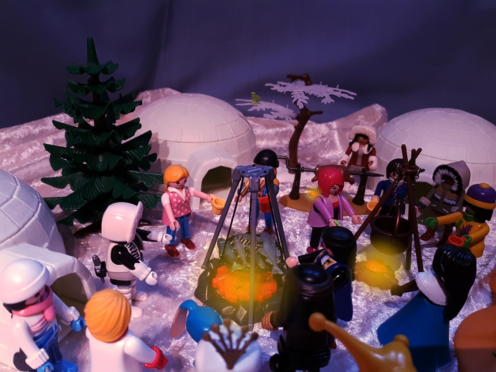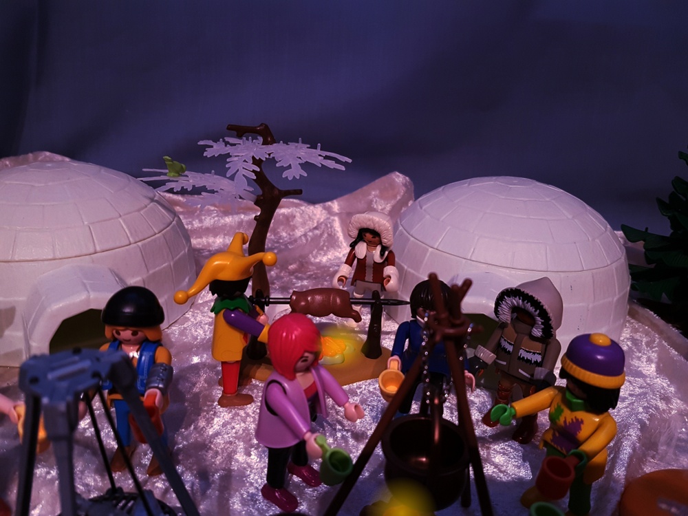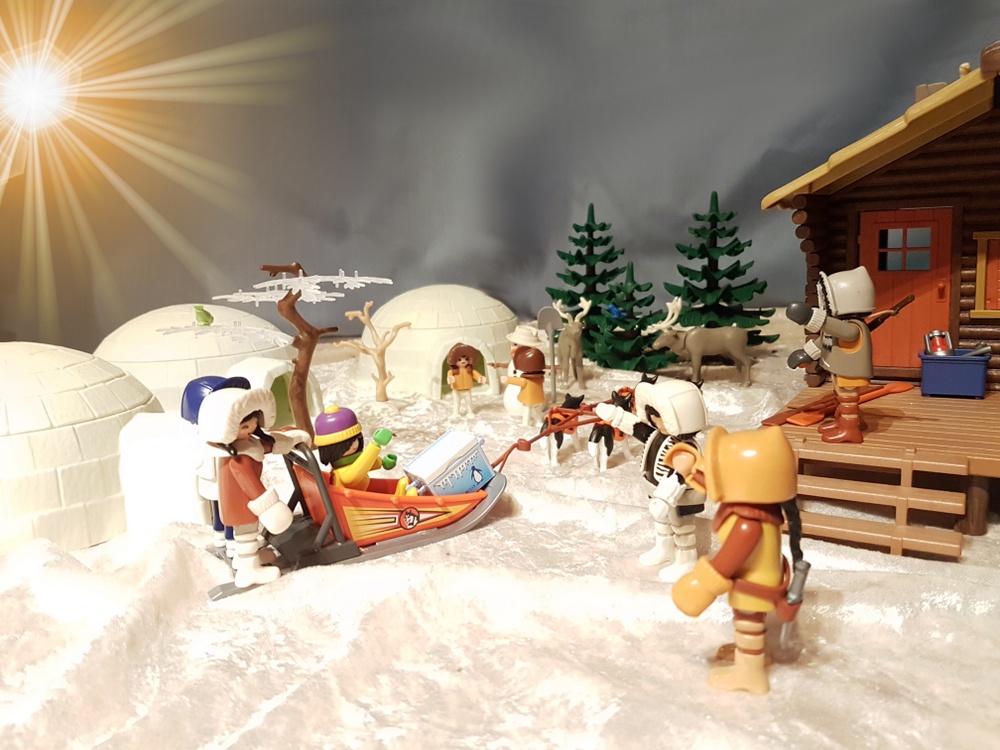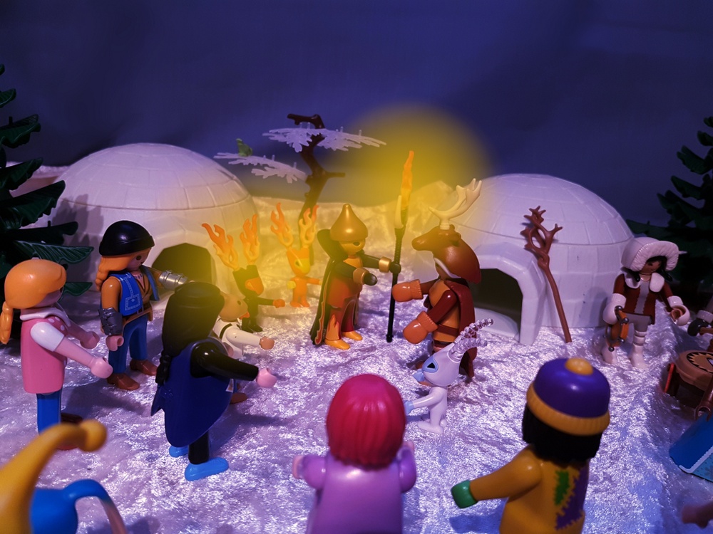 Bei Sonnenuntergang erreichen wir den Heiligen Ort der Inuit, an dem die Eiskugel wieder zusammengesetzt werden soll. Die anderen Rallyeteams erwarten uns schon mit ihren Bruchstücken der großen Eiskugel.