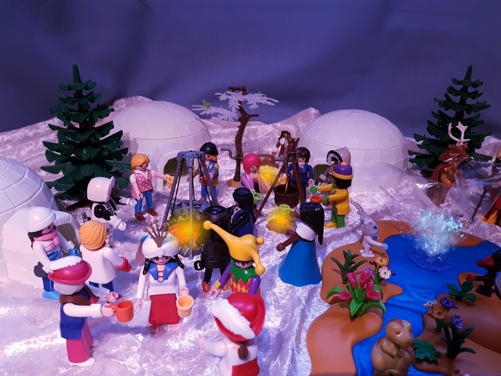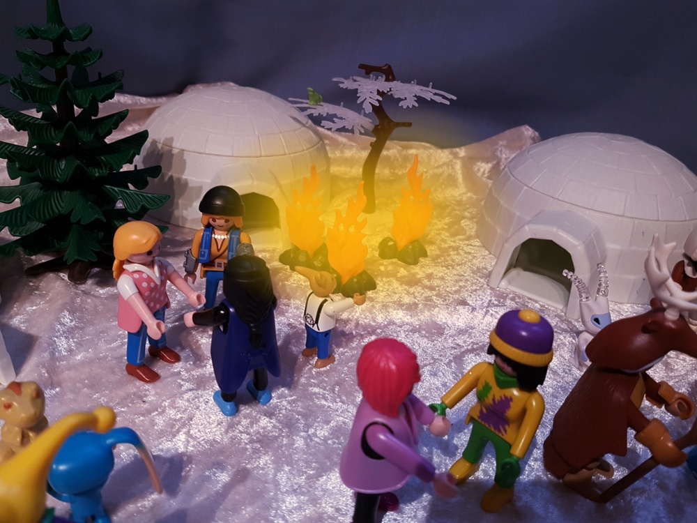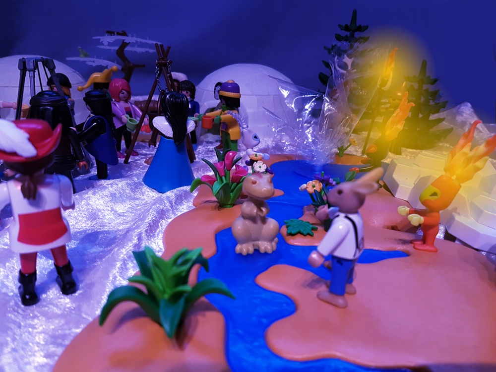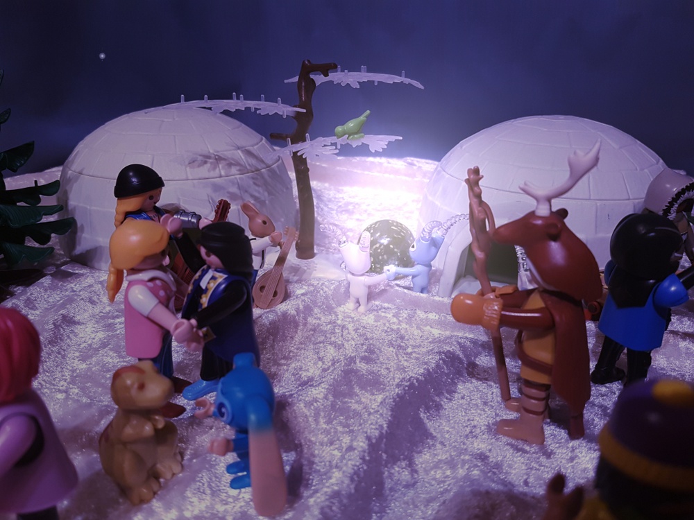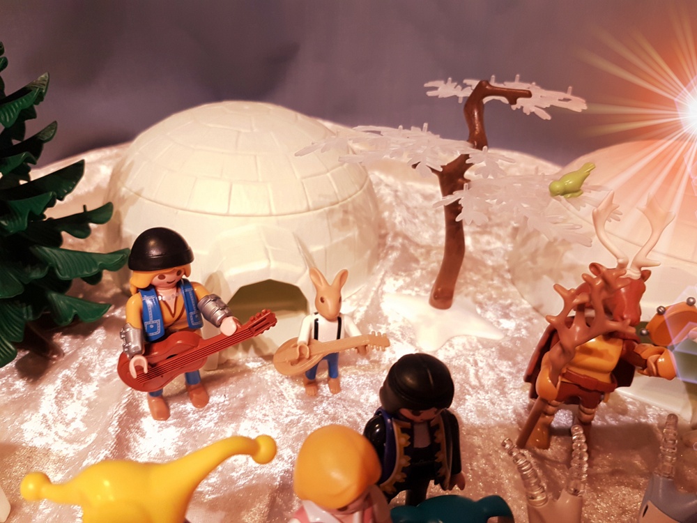 Wir schmausen und genießen die warmen Feuer in der kalten Polarnacht. Trüffel kann es sich nicht verkneifen und testet das warme Wasser die Friedensquelle. Möhrchen dagegen lässt sich trotz minus 15° Außentemperatur nicht ins badewannenwarme Wasser locken. Fräulein Qvanilla und Herr Feurich reden sehr lange und freundschaftlich miteinander. Wir haben das Gefühl, dass sie viele komplizierte Dinge über das Gleichgewicht der Welt besprechen, die keiner von uns versteht. Wir dagegen machen lieber Party bis tief in die Nacht hinein. Und so eine Polarnacht dauert lange!