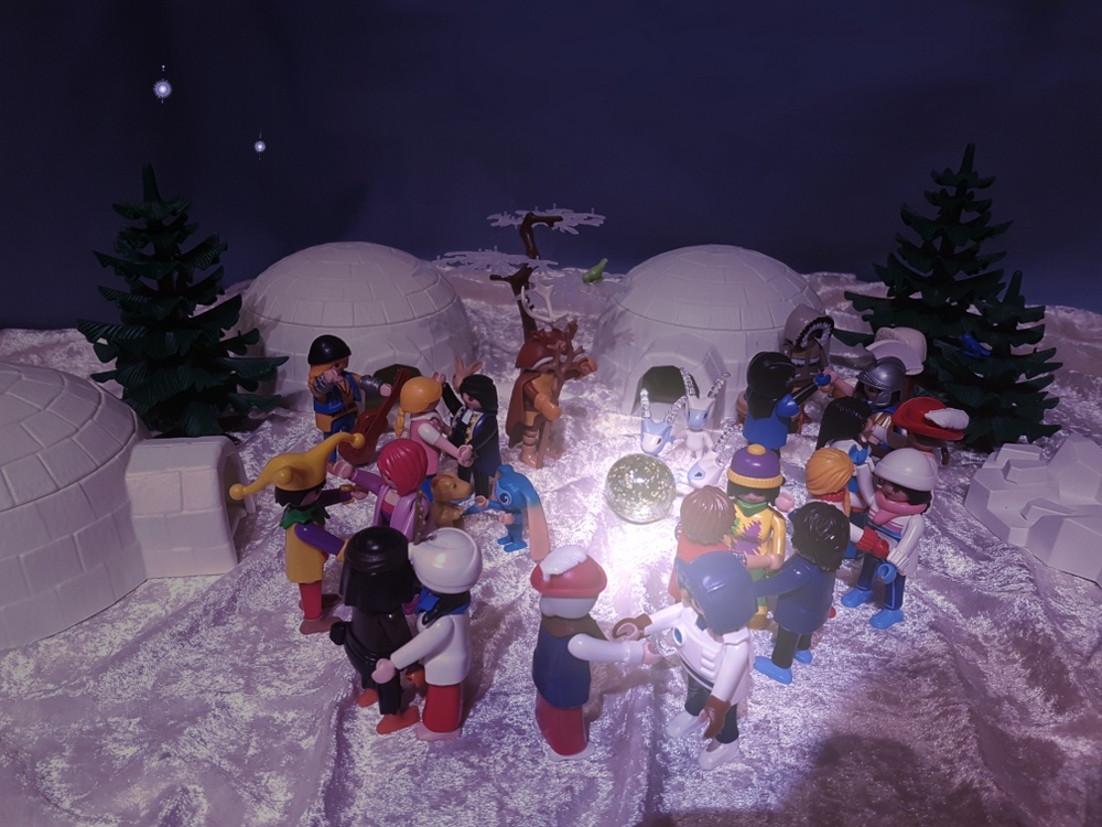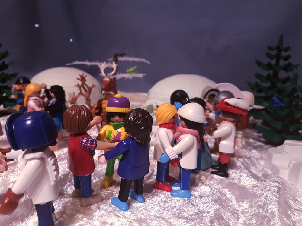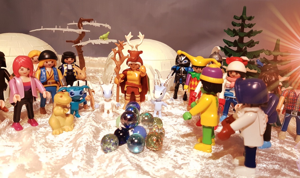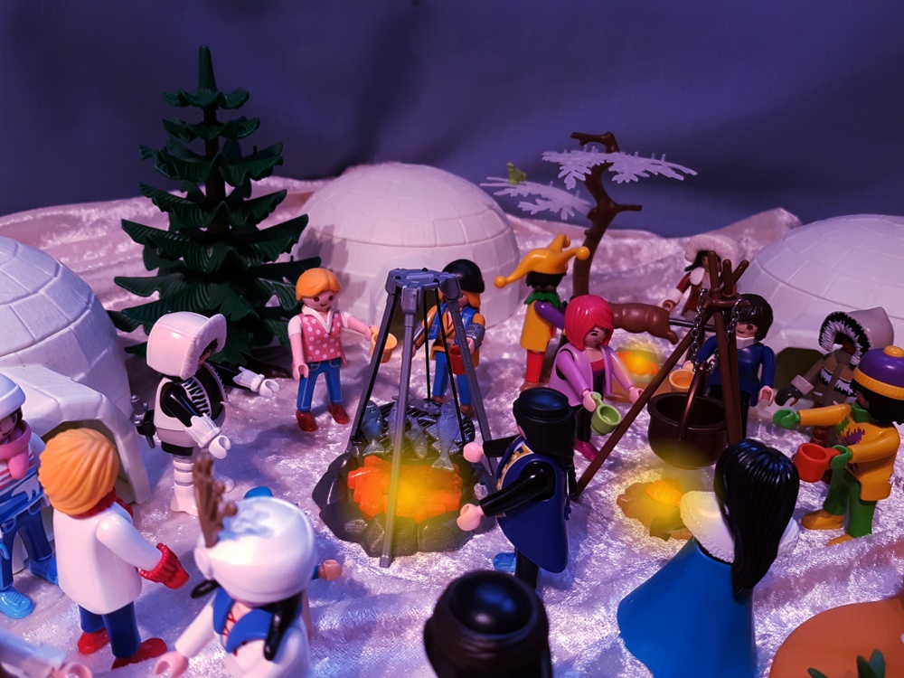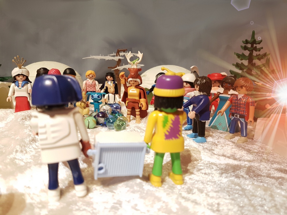 Wir schmausen und genießen die warmen Feuer in der kalten Polarnacht. Trüffel kann es sich nicht verkneifen und testet das warme Wasser die Friedensquelle. Möhrchen dagegen lässt sich trotz minus 15° Außentemperatur nicht ins badewannenwarme Wasser locken. Fräulein Qvanilla und Herr Feurich reden sehr lange und freundschaftlich miteinander. Wir haben das Gefühl, dass sie viele komplizierte Dinge über das Gleichgewicht der Welt besprechen, die keiner von uns versteht. Wir dagegen machen lieber Party bis tief in die Nacht hinein. Und so eine Polarnacht dauert lange!