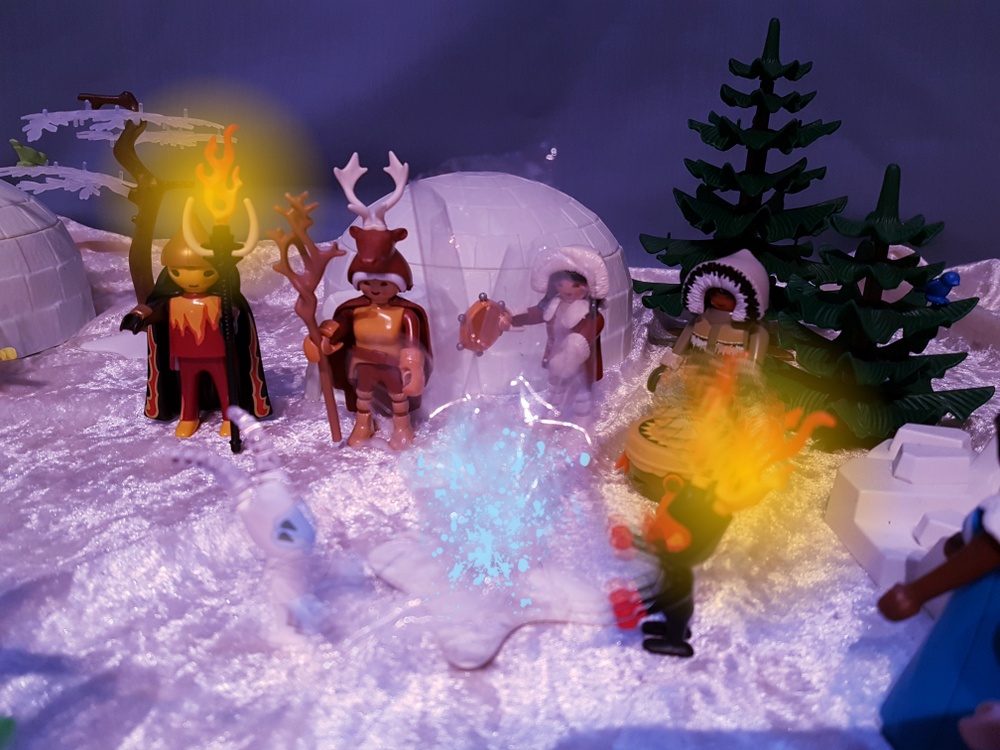 Zwei der Inuit beginnen, einen schnellen Trommelrhythmus zu spielen. Ein Eiswesen und ein Fuego stellen sich auf und beginnen zu tanzen. Dabei umkreisen sie einen gemeinsamen Mittelpunkt. Schneller und immer schneller wird der Trommelrhythmus und immer schneller tanzen das Feuerwesen und das Eiswesen. Und durch die gemeinsamen Kräfte von Feuer und Eis beginnt in der Kreismitte eine Quelle warmen Wassers zu sprudeln. Es bildet sich ein kleiner Teich.