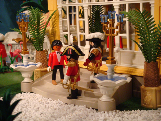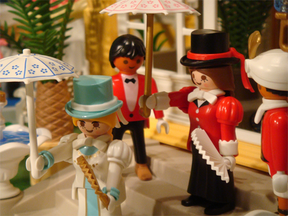 Rezeptionist: "Die Kutsche wird gleich vorfahren. Das Gepäck werden wir sofort zum Schiff bringen lassen! Wenn die Damen vielleicht noch Platz nehmen wollen?"