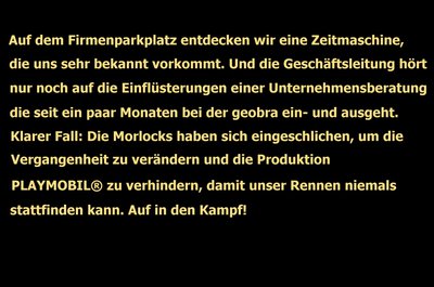 EF Feld 2: Ein gemopstes Tartarbrötchen (fränk. Ausgstraaftaa) von einer Ausstandsfeier hat dich vorübergehend außer Gefecht gesetzt. Auf der Suche nach den Toiletten bist du im Kellergeschoss gelandet und siehst gerade noch, wie ein Morlock mit einem Arm voll Dynamit um die Ecke flitzt. Fang ihn ein und mach ihn unschädlich, bevor... Oh, gar nicht auszudenken! Nicht nur die ARL erwartet gespannt deine Erfolgsmeldung … BGPs warten auf dich!
