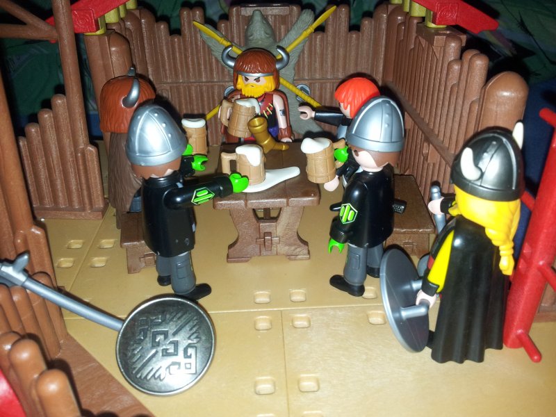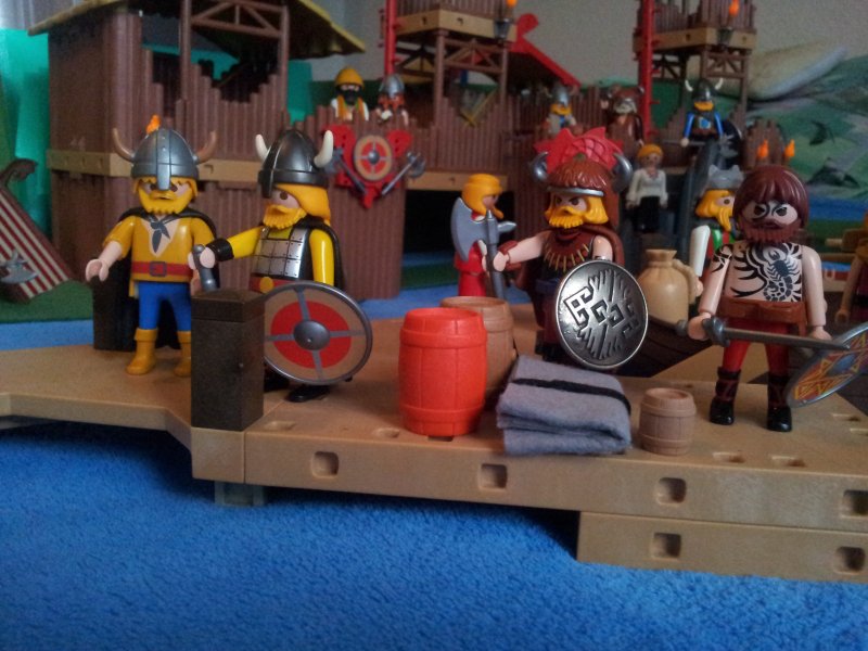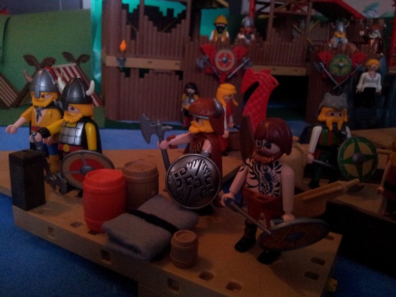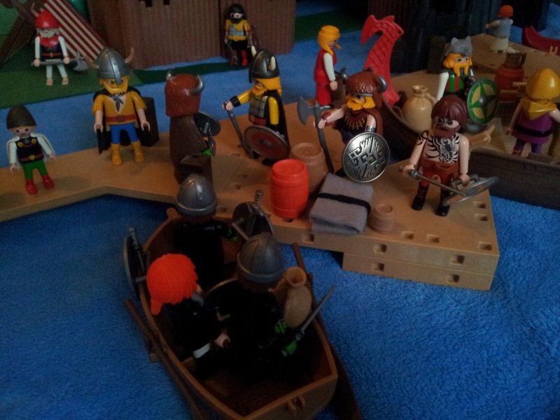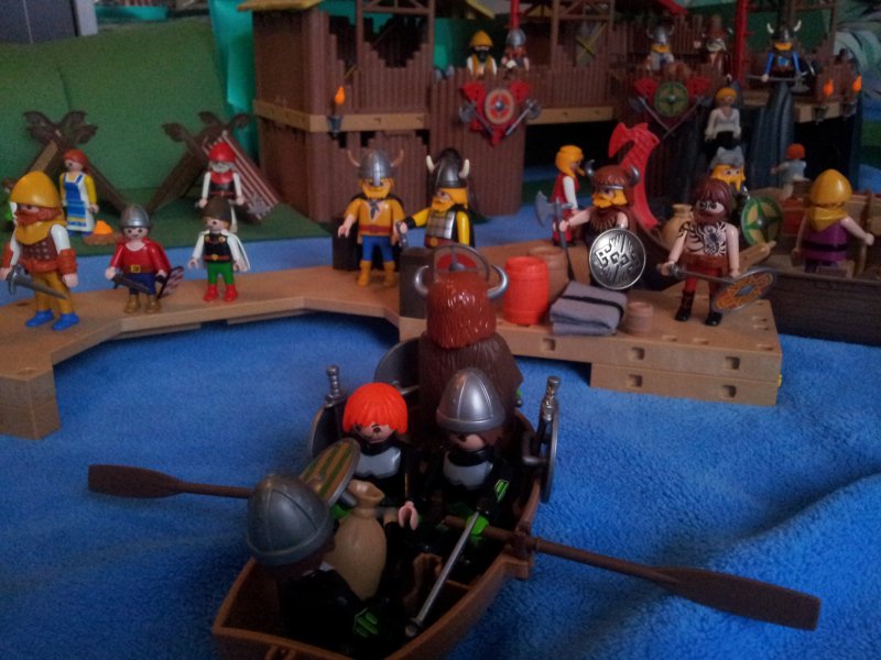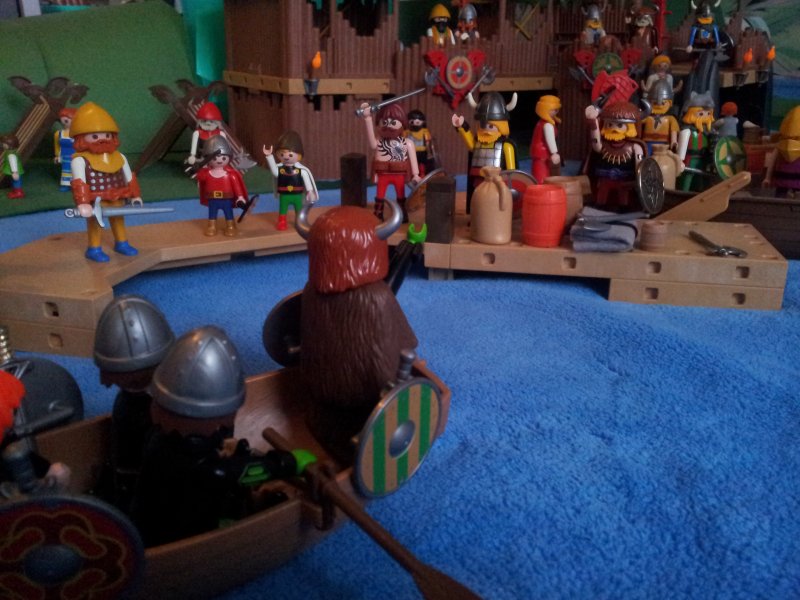 Das Ziel der Reise, die Wikingersiedlung. Klein, aber mit den Bewohner möchte man trotzden lieber keinen Streit.... Das Team landet sein Boot an einem Steg Das Empfangskomitee.....recht finstere Gestalten Willkommen !