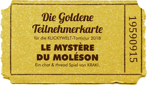 Die KLICKYWELT-Tort(o)ur startet mit der Etappe I am 15. September d. J. Daher sollten die Teilnehmer(innen) ihre(n) Stellvertreter/in(nen) bis zum 9. September 2018 in diesem Schwarzen-Brett-Thread vorgestellt haben. Eine Teambildung ist gerne gesehen, aber nicht zwingend erforderlich. Die Anmeldefrist kann dann - bei Bedarf - immer noch verlängert werden ...