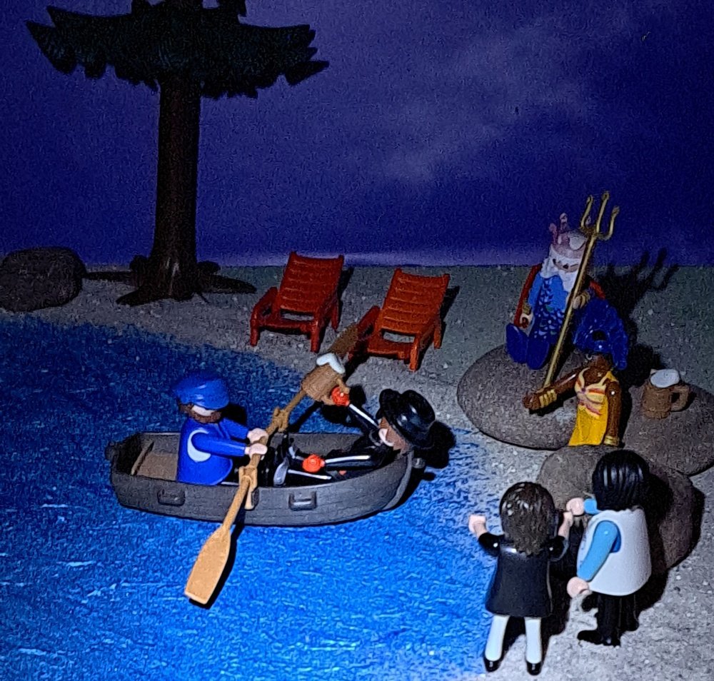Wir liefen Richtung See, wer saß den da vergnügt im Ruderboot und sang lautstark? Es waren Fischkopp Claas und Playmo-Fritz.