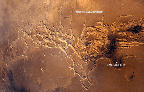 Feld VIII-2/8-2: Sie sind ein weitläufiges Grabenbruchsystem auf dem Mars, die sich mit einer Länge von 4.000 km, einer Breite bis zu 700 km und einer Tiefe bis zu 7 km längs des Äquators erstrecken. Die Valles Marineris erhielten ihren Namen zu Ehren der Sonde Mariner 9, auf deren fotografischen Aufnahmen sie entdeckt wurden. Möglicherweise wurde die Region bereits von Giovanni Schiaparelli (1877) oder Anderen beobachtet und 1972 als „Marskanal“ kartiert. Seltsamerweise war von Marsianern nie die Rede. Dir fällt passenderweise die HP-Werbung ein. Im Oudemans-Krater – im SO vom Noctis Labyrinthus (lat. Labyrinth der Nacht), dem westlichen Ausläufer des Grabenbruchsystems – liegt Emerald City, die Hauptstadt des Marsianischen Imperiums, wo wir Urania vermuten. Immer noch keine Reaktion!