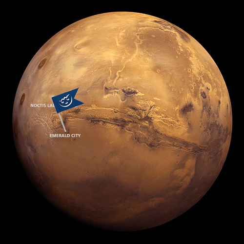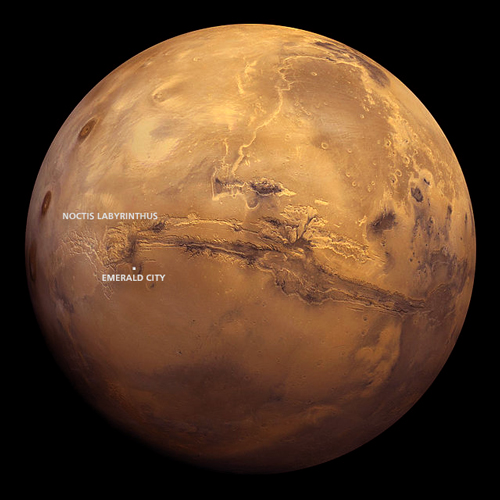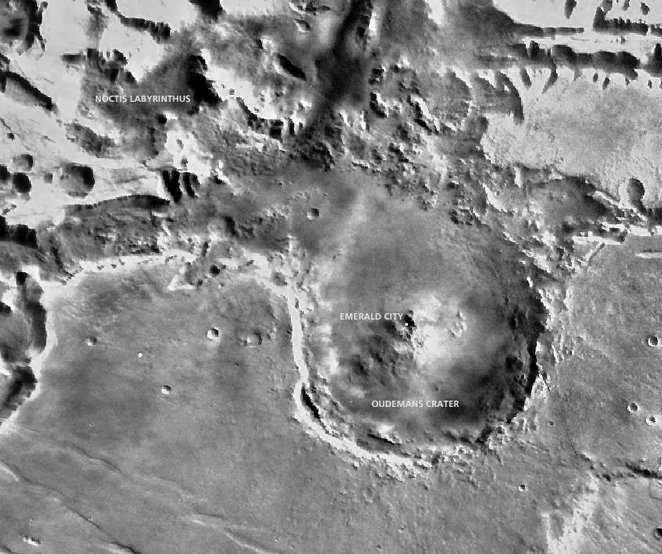 Bei dem Krater, in dem die marsianische Hauptstadt Emerald City (dt. Smaragdstadt) handelt es sich um den Oudemans Crater – benannt nach dem niederländischen Astronomen Jean Abraham Chrétien Oudemans (1827 – 1906). Er ist 124 km breit und seine Koordinaten sind: 10.0°S 91.9°W.