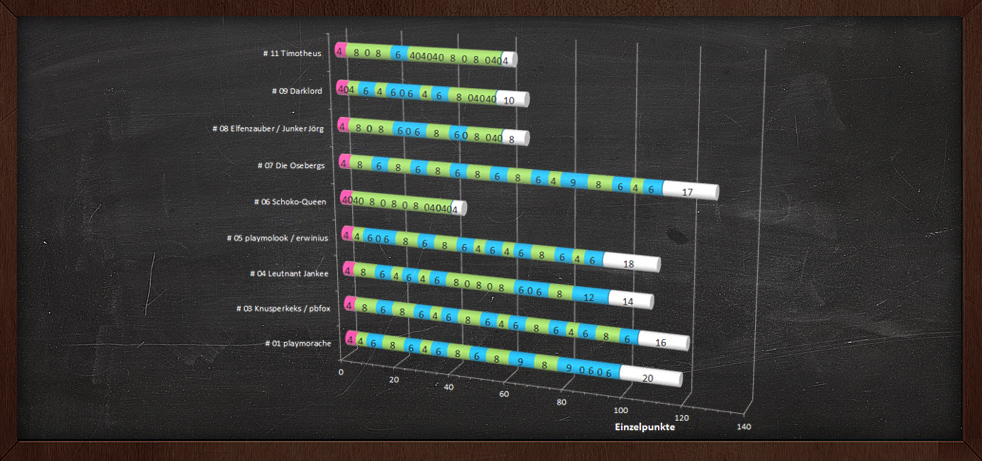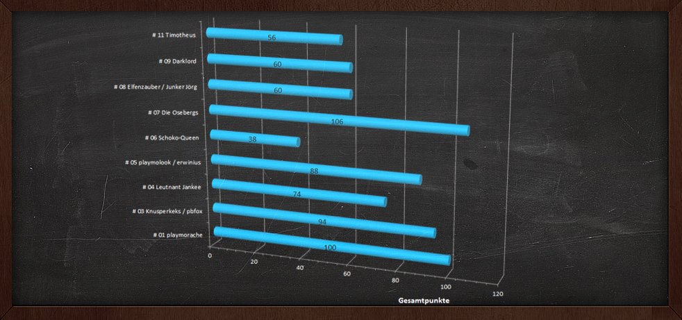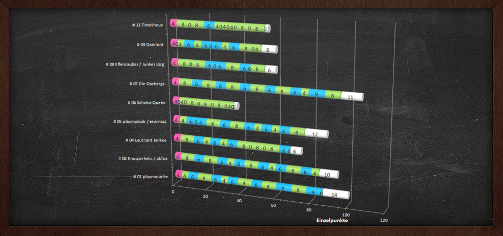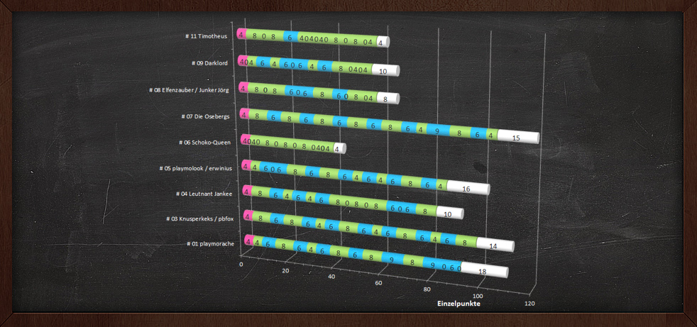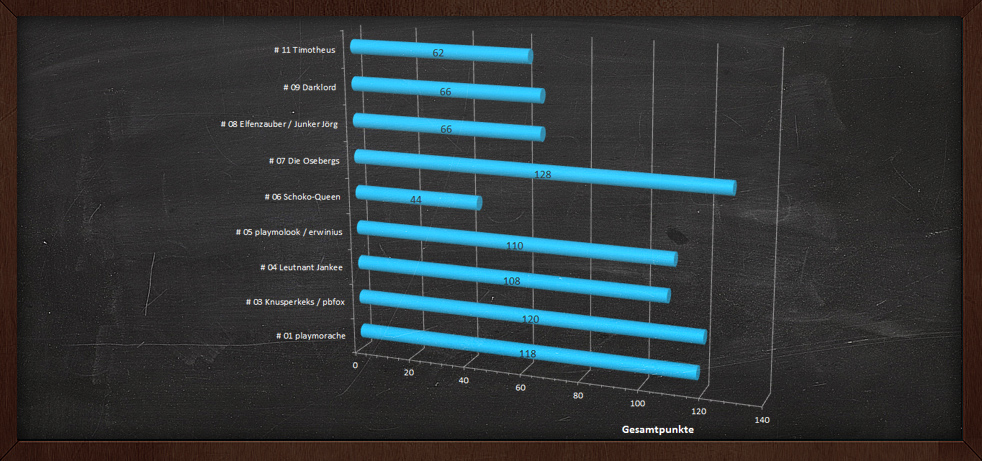 P. S. Bitte denkt daran: Heute, Schlag Mitternacht (UTC + 01:00), ist der Abgabeschluss für etwaige Geschichten! Zwischenpunktestände nach der letzten Würfelrunde anbei.