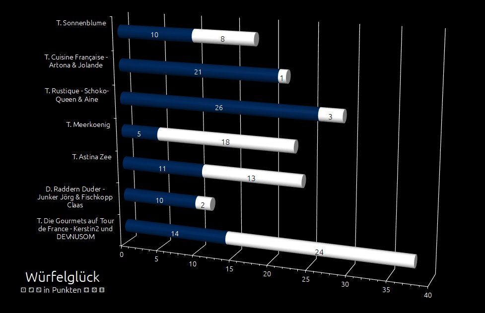 DEVNUSOM vom Team Gourmets startet als erster den Würfelmotor, doch deine Teamkollegin Kerstin2 kommt ihm zuvor: Sie würfelt eine . "Ich sehe da ein kleines Trüffeltierchen", lautet der Kommentar von Flatterfee. Kerstin2 wählt einen Dackel. Jetzt zählt's! DEVNUSOM setzt nach mit einer . Huiii ... Der Kanichenbau von Feld 5. Die Frage ist: Wie viele Punkte bleiben hängen? Kerstin2 legt vor mit einer . DEVNUSOM legt nach mit einer und Kerstin2 würfelt eine . In Summe 12 Punkte - 7 Punkte. Das macht 5 Punkte für das Team Die Gourmets auf Tour de France.