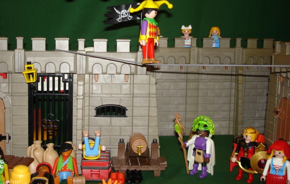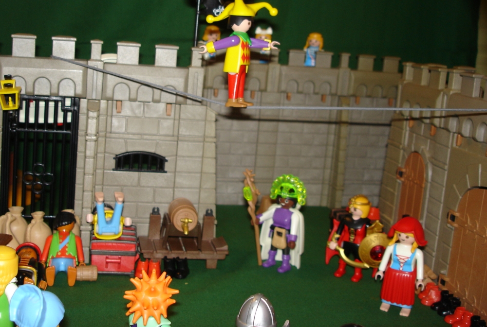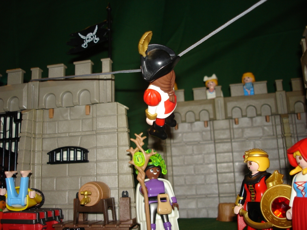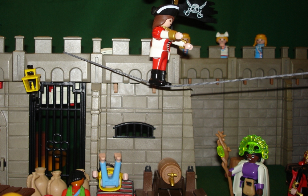 Und so wird rasch ein Seil über dem Marktplatz von Spittlefield Harbour gespannt.