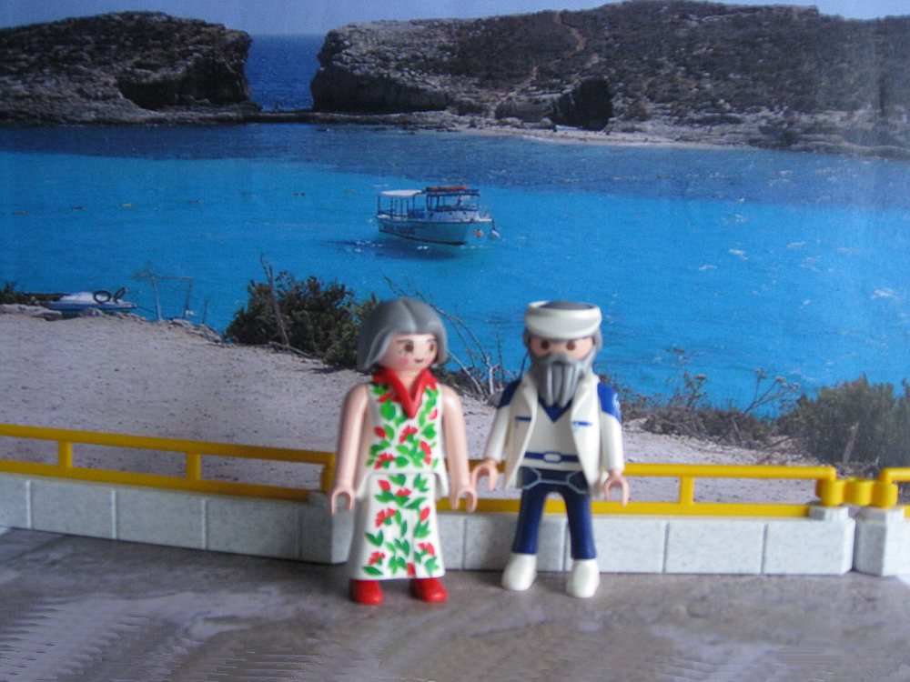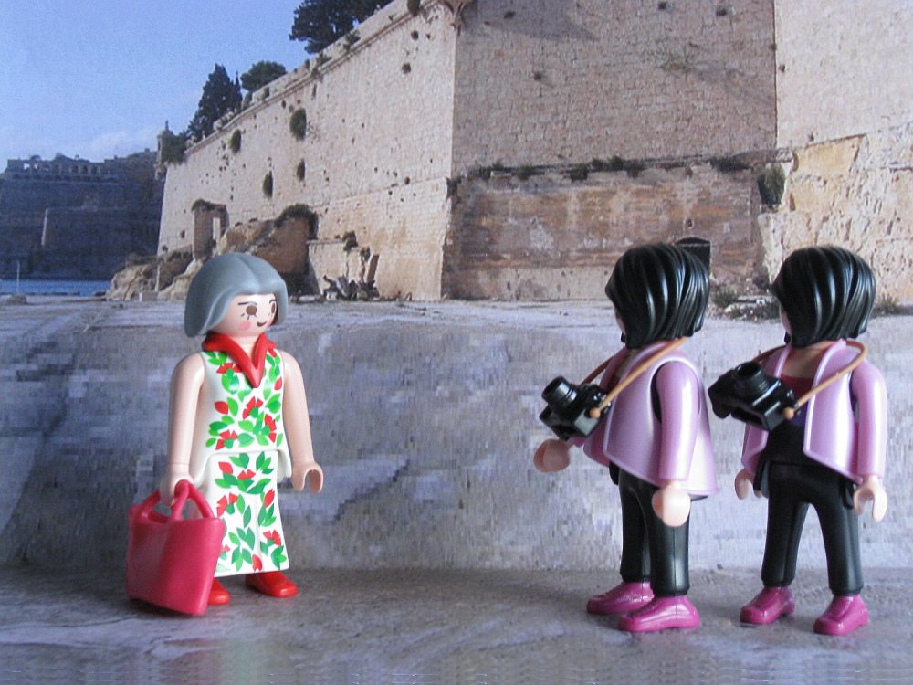 Hir sehen wir sie zusammen mit zwei zufällig anwesenden chinesischen Touristinnen auf dem Weg vorbei am Fort St. Angelo.