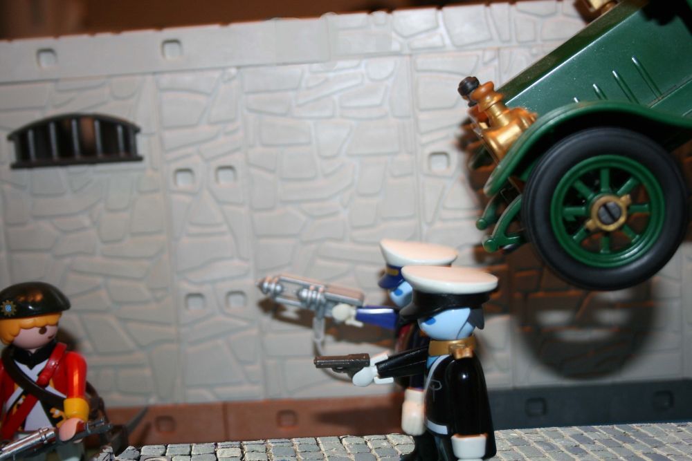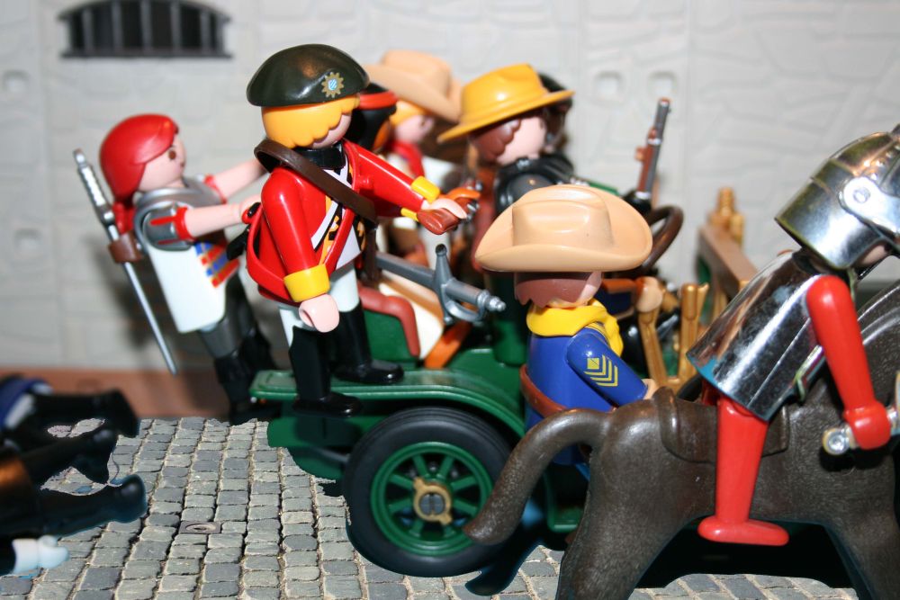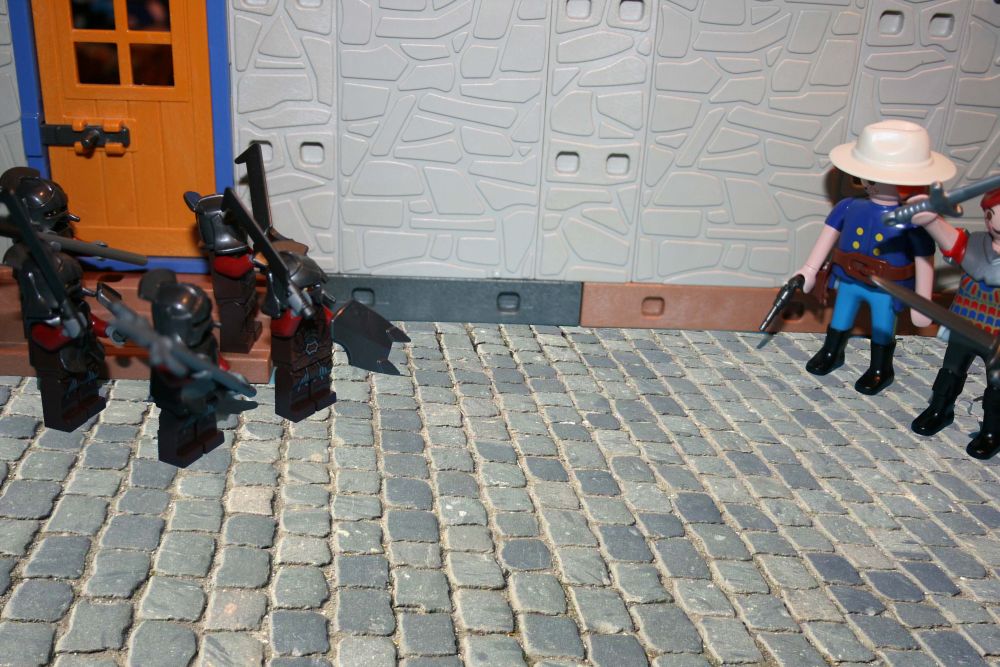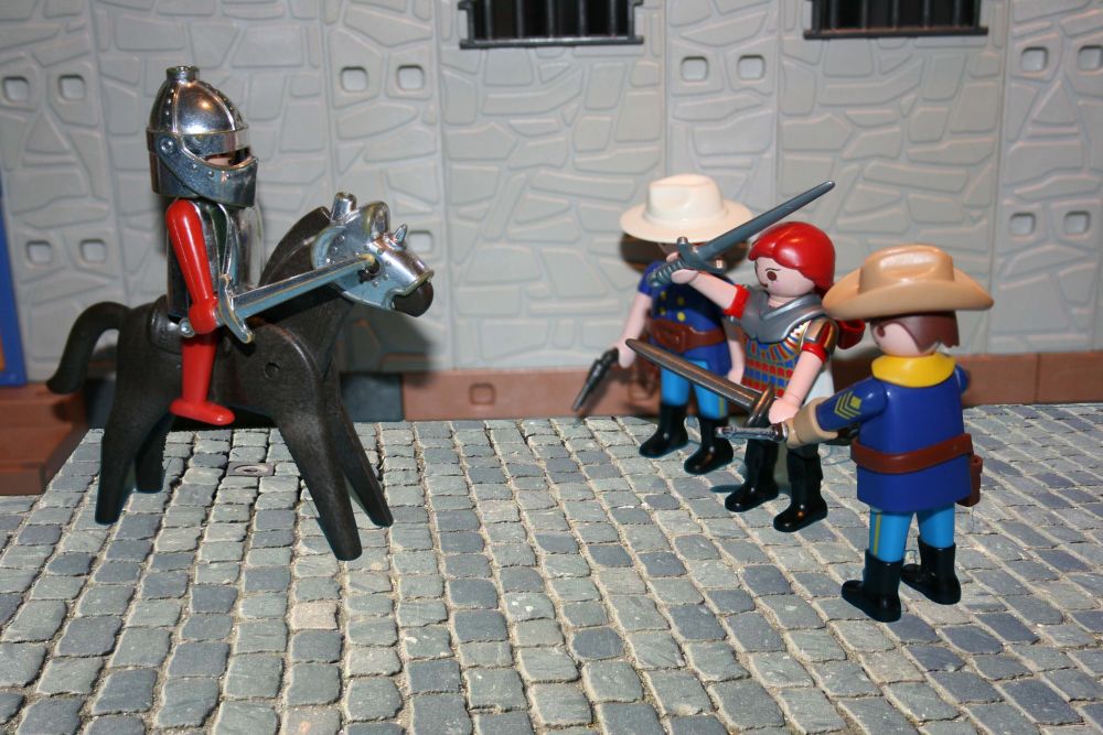 Schließlich entdeckte uns eines der UFOs und nahm uns unter Beschuss. NAch einem Volltreffer auf den Ballon mussten wir deshalb runtergehen und versteckten uns in der Stadt Dort kämpften wir uns langsam vorwärts, auf der Suche nach einer Möglichkeit, den Riss zu flicken Als wir gerade in einer engen Gasse waren, hörten wir plötzlich Hufgetrappel und machten uns kampfbereit, in der Erwartung, die Marsianer hätten uns gefunden Doch es kamen keine Marsianer, sondern ein Reiter in einer rot-silbernen Rüstung um die Ecke! "Platz da, beiseite Gesindel! Ich Rudolph der Rote bin gekommen! Lasst mich durch!"