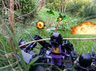 "Dann müssen wir sie halt mit unseren Handfeuerwaffen besiegen! Googol - halt uns den Rücken frei. Ultrafinitisma - lass und die Wummen auspacken!" "Dunkler Lord, soll ich nicht doch lieber aus dem Orbit ..." "Nein! Wie stehen wir denn dann da!"