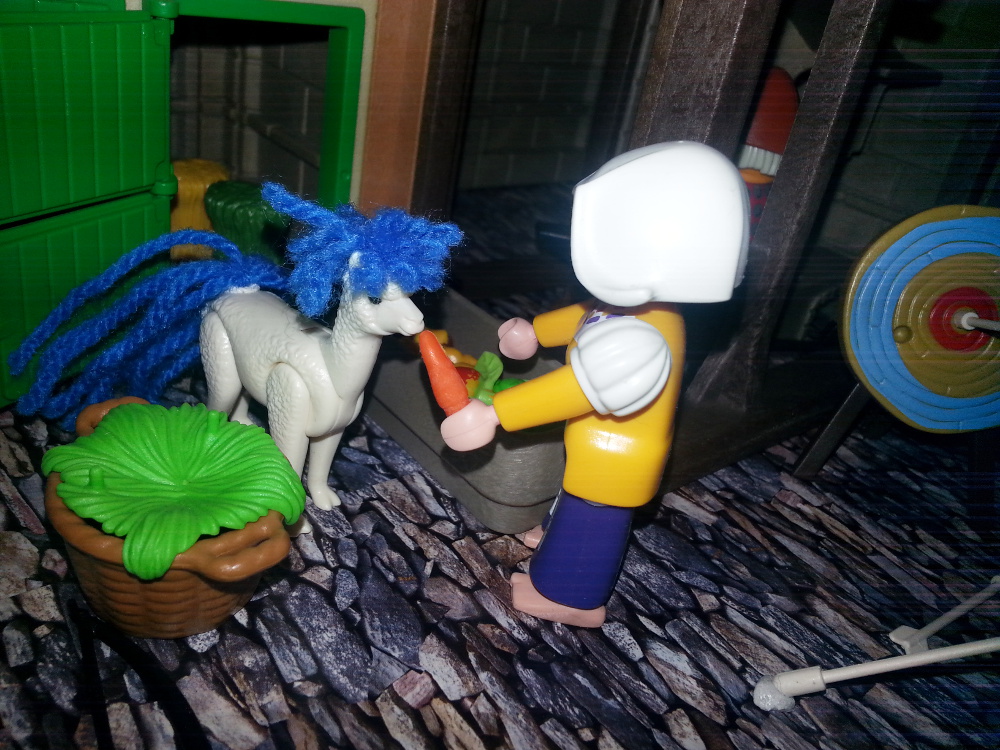 Das Blauschopfalpaka wird von Liesel mit Möhren verwöhnt.