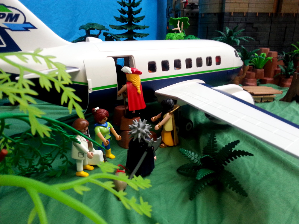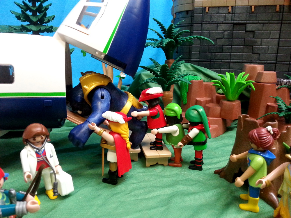 Das Flugzeug landet auf einer Lichtung nahe der Burg und zwei Frauen steigen aus...