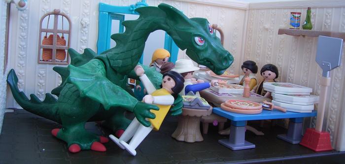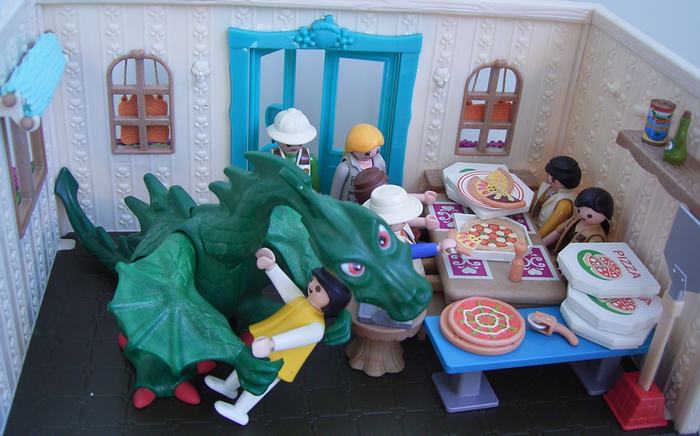 Der Pizzaschneider und ein Teil der Pizzadeko stammt von Sylvanian Families, was eigentlich immer super zu Playmobil passt (Ausnahme Autos und manche Stühle).