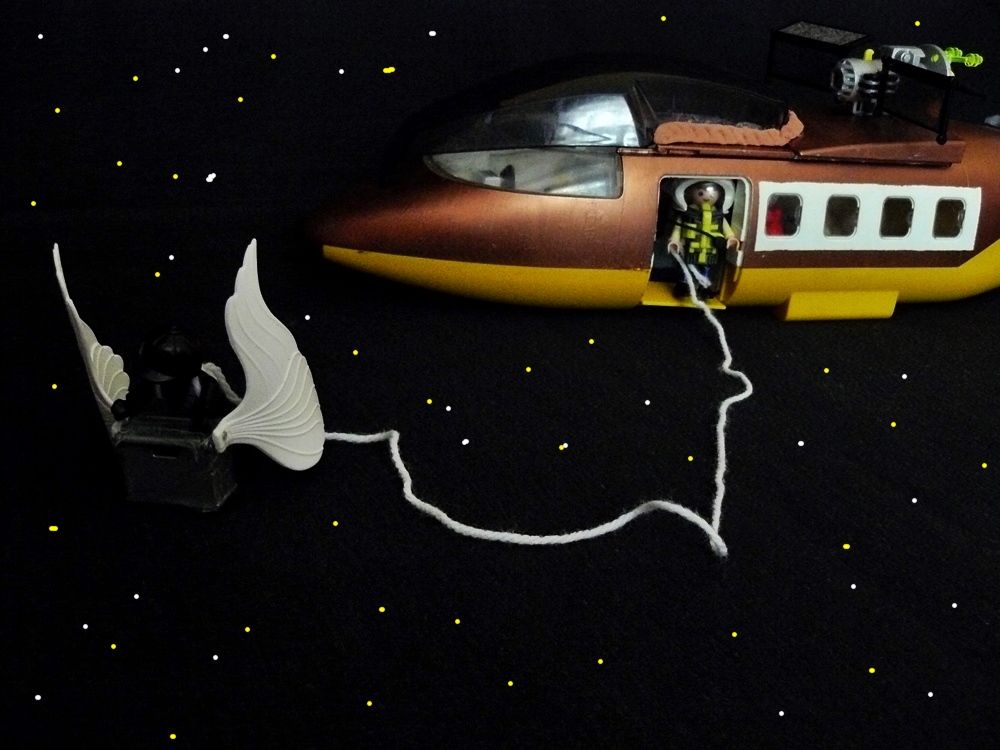 Zwerg Nase ziehe deinen Raumanzug an!“ Ponko, gesichert durch Zwerg Nase, macht sich auf den Weg zu der Kiste mit Flügeln.
