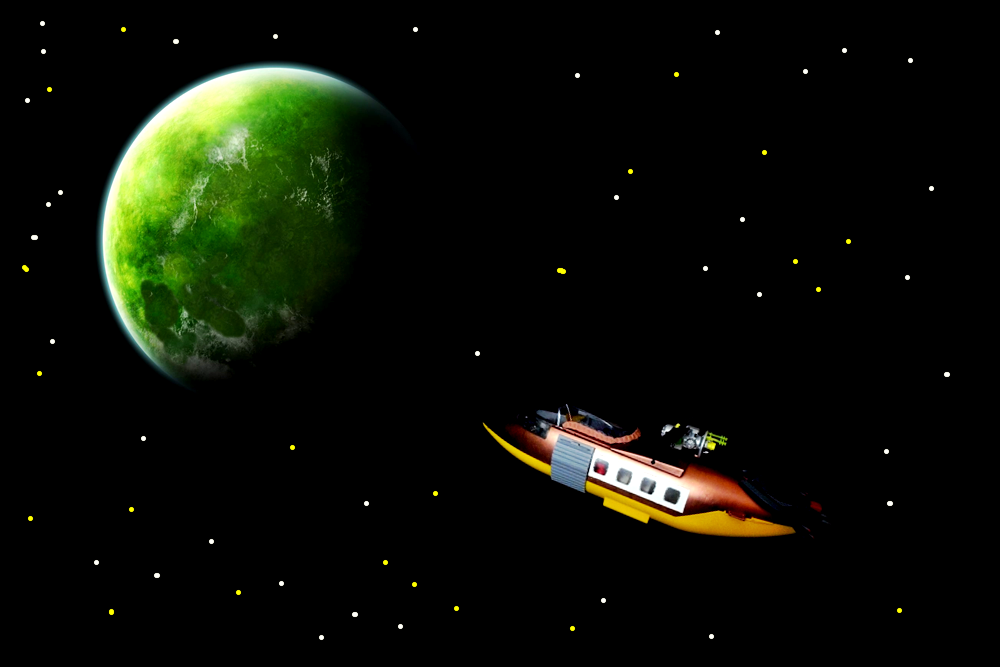 Planet sehr grün und blau und auch Menschen immer, ä… ich meine blau. Ponko: „Ich habe da noch einen Bausatz eines Raumfahrzeuges