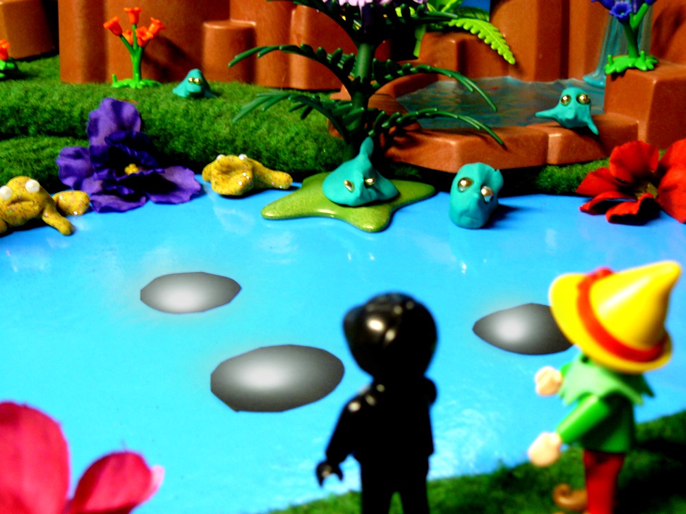 „Komischer Planet, komische Tiere, ganz gruselig.“ Ponko lacht. Zwerg Nase dreht sich erschrocken um. Irgendetwas raschelt im Gebüsch