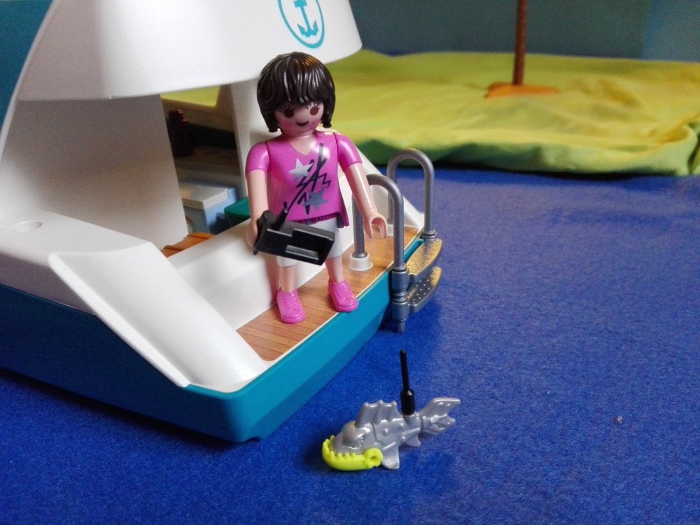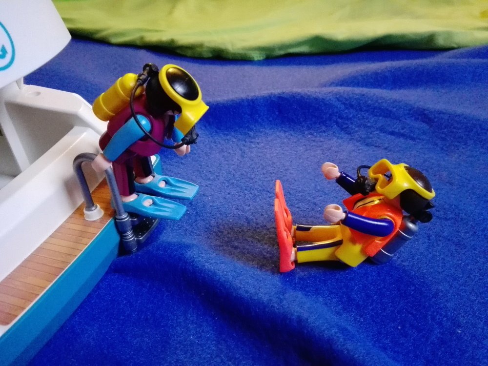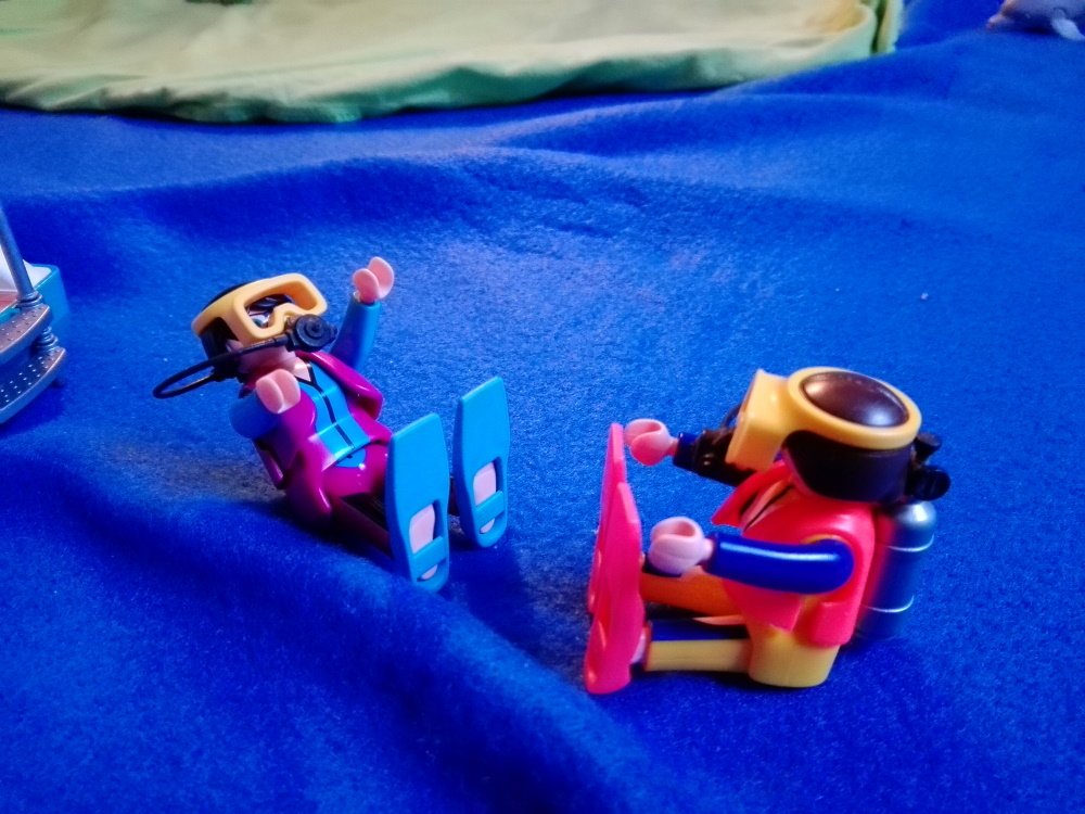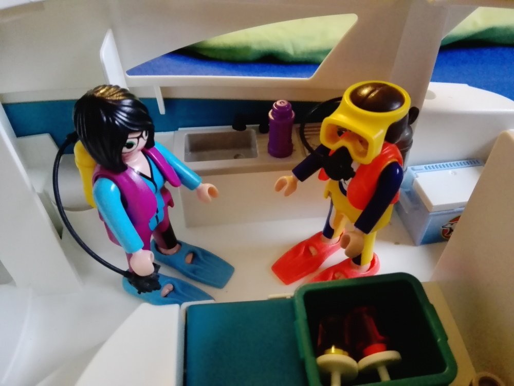 Nachdem Sharky wieder verstaut ist, ziehen sich Jenny und playmolook ihre Taucheranzüge an.