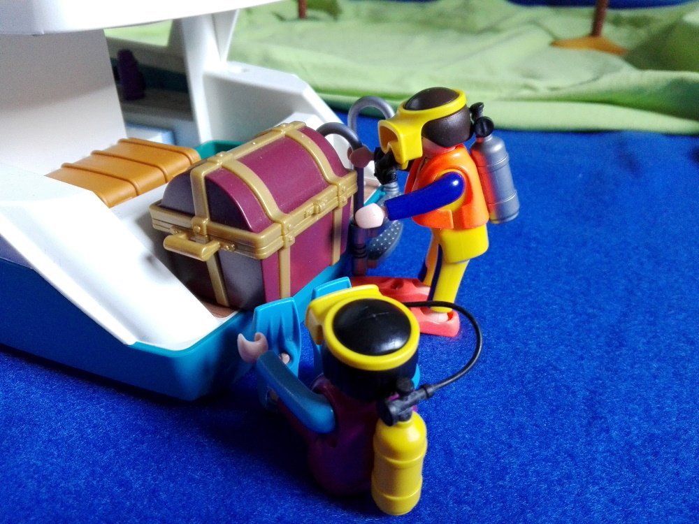 Wenig später sind Jenny und playmolook wieder an der Wasseroberfläche und hieven die Truhe an Bord des Schiffs.