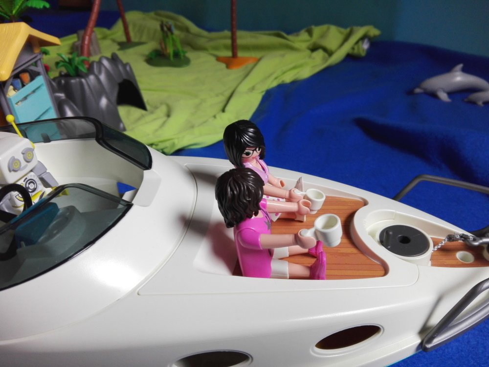 Nachdem die beiden die Truhe verstaut und sich umgezogen haben, sitzen sie auf dem Sonnendeck der Yacht.