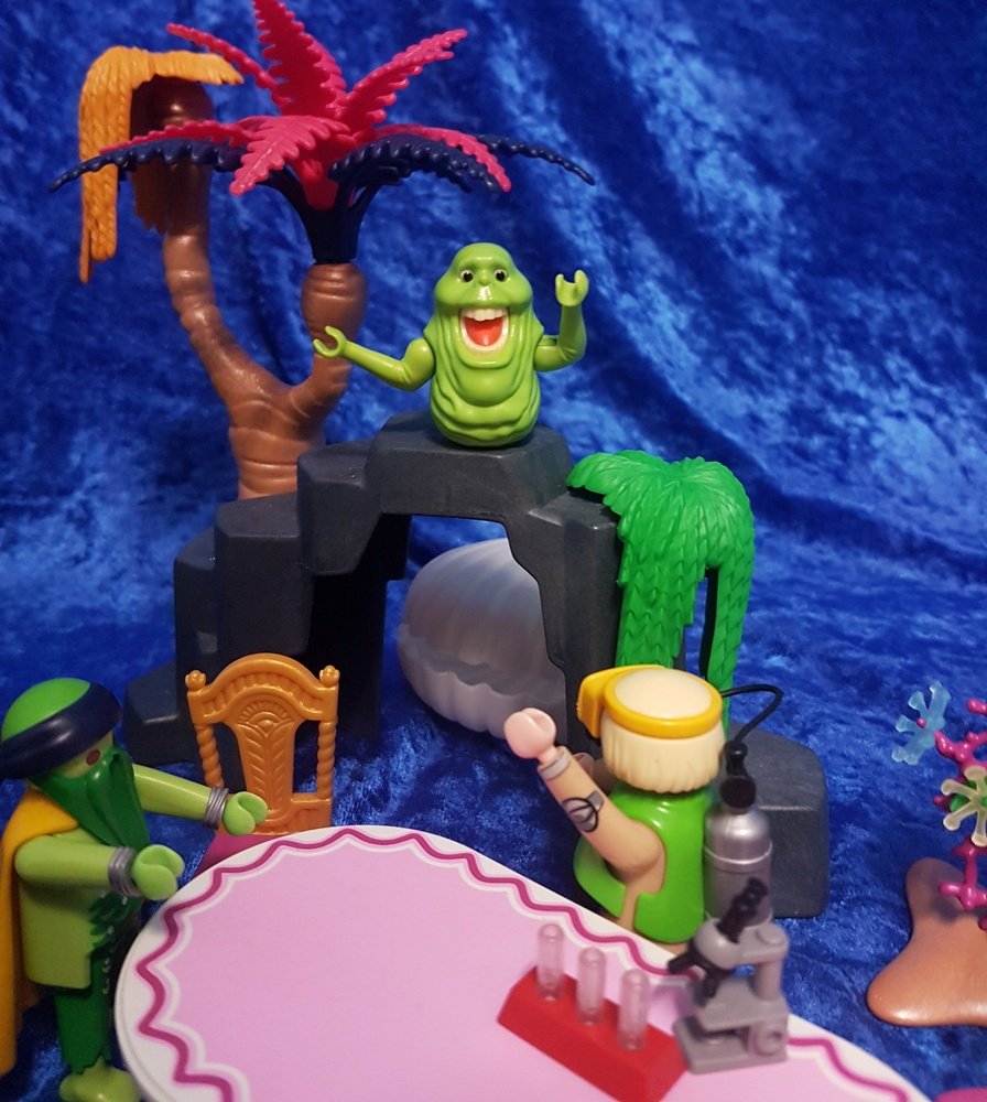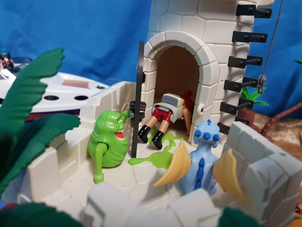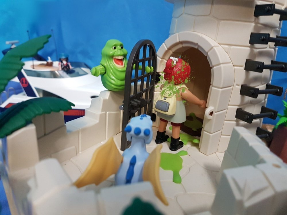 Mit lautem Gelächter erscheint ein grünes Schleimmonster hinter dem Eingang.