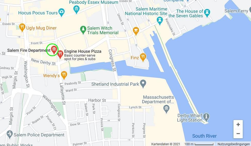 „Nö, aber es gab ja auch kein Suchbild. Vielleicht im entsprechenden Museum? Das gibt es ja wirklich ... außerdem haben uns doch die Hexen, ähm, Unternehmerinnen in die Alte Feuerwache eingeladen. - Dann wohl ins Hexenhaus von Salem. Also Essex Street Kreuzung Summer Street.“
