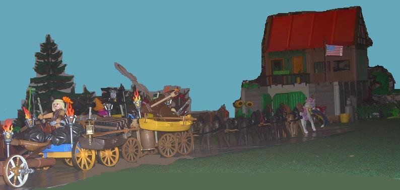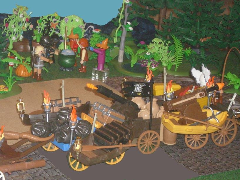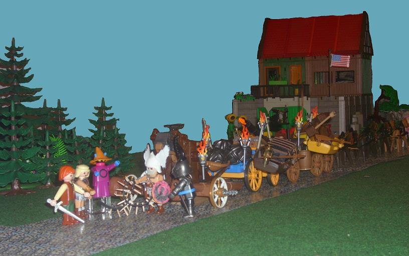 "Nicht schlimm, bei den Bauern dort drüben werden wir bestimmt Ersatz für die vier kaputten Räder erhalten."