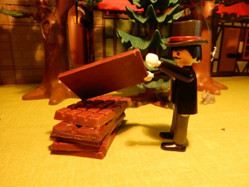 Er ergreift ein Schokoladenbrett. Ich nehme mir auch eines.