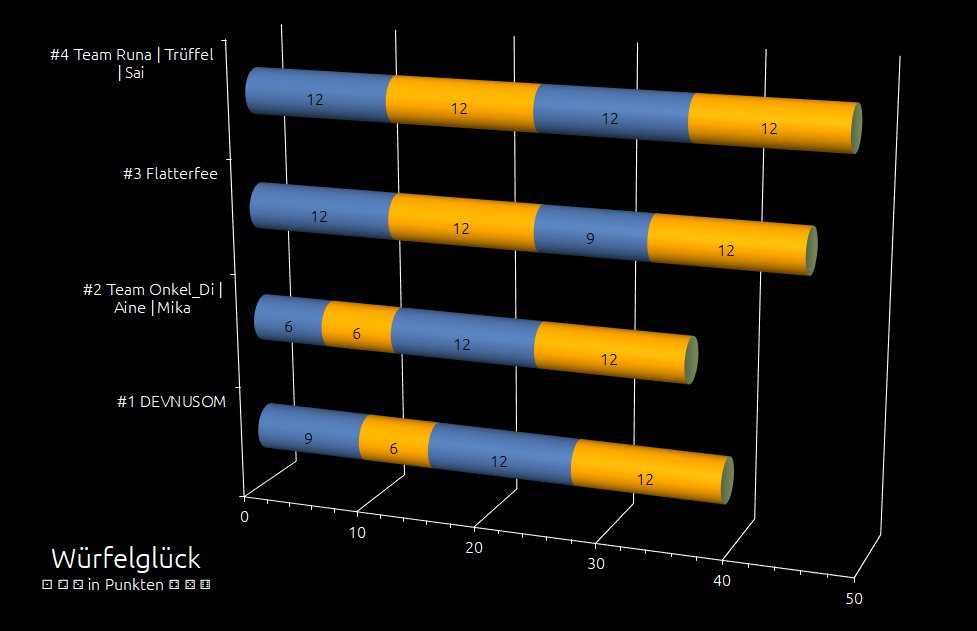 Team Onkel_Di | Aine | Mika: Onkel_Di ist bescheiden. Das Team mit der № 4 erhält nach einer 3 bars ADORE'S Fancy Milk Chocolate "Ich bin kein Fuchs; ich bin ein japanischer Waldgeist!", soll den Trophäensammler Paltsgrave beschwichtigen. Ich stelle mir gerade vor: Die Abenteuer von Odi Kitsune im Aokigahara ... Ne, ne, nicht wirklich! Aine übernimmt: Eine = Zeit für ein Doppeldüll. DEV übernimmt Zzyzx und Aine gewinnt mit 131 : 109 [54 : 12, 21 : 45 und 56 : 52]. Das Team macht 3 bars ADORE'S Fancy Milk Chocolate gut. Eine später fällt die Entscheidung: Das Team macht weiter - Extrarunde! Eine = wieder 3 bars ADORE'S Fancy Milk Chocolate vom Paltsgrave. Noch eine = erneut 3 bars ADORE'S Fancy Milk Chocolate vom Paltsgrave. Nein, der Paltsgrave und sein Kumpel sind nicht senil, DEVNUSOM. Sie meinen's nur gut. S c h m e r z e n s g e l d ... Die rettet mich aus der Bredouille. 15 bars ADORE'S Fancy Milk Chocolate en total für das Team Onkel_Di | Aine | Mika. Ich bin froh, dass ich euch dabei hab: Onkel_Di, weil du im richtigen Moment eingesprungen bist. Aine, weil deine Geschichten mir zeigen, wo meine Reise hingeht. Danke. 💐💐💐