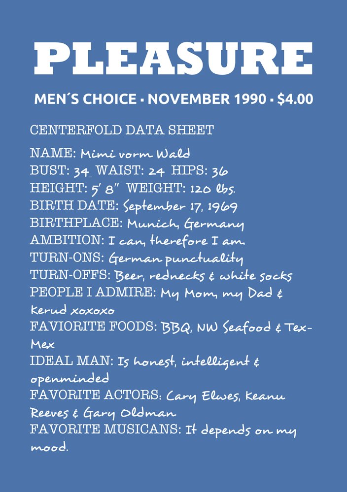 Wir wissen, dass Mimi ein ausgesprochener Freigeist ist. Deshalb bewarb sie sich auch für's PLEASURE Magazine - einem PLAYBOY-Surrogat. Den PLAYBOY lesen meine Frau und ich schon seit Jahrzehnten. Außerdem sammle ich alte US-amerikanische und deutsche PLAYBOY-Hefte, die den Zeitgeist sehr gut widerspiegeln. Es bleibt nicht aus, dass mit dem Magazin Einzelschicksale verbunden sind: Ich denke da beispielsweise an Marilyn Monroe, Dorothy Stratten [