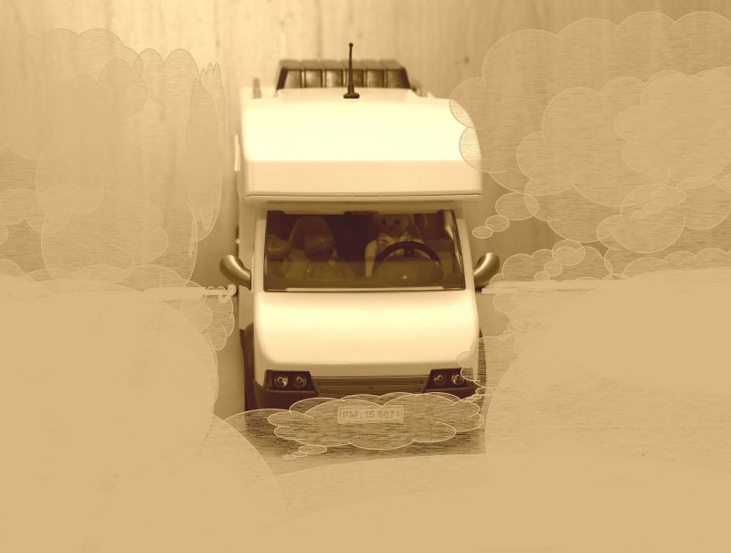 „Das ist aber eine ungemütliche Fahrt“, stöhnt er. „Ich stoße mir immer meinen Kopf! Gibt es hier keine besseren Straßen?"