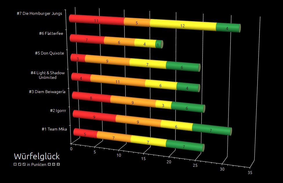 Beim Team Light & Shadow Unlimited hat Kerstin die Hände am Volant. Ihr Start ist so rasant, dass es ihren Teampartner ins Leder drückt. Sie schneidet die Kurven, als gäbe es dafür Extrapunkte. Doch die fallen bei dieser Etappe leider aus – zu sehr ist die Rennleitung damit beschäftigt, kein Team im Gewusel der Großstadt zu verlieren. Statt der Extrapunkte zähle ich bei dem wilden Ritt drei umgemähte Briefkästen, zwei Hydranten, fünf Verkehrsschilder und einen Hot-Dog-Stand, dessen Besitzer bei seiner Flucht fast gegen ein Stop-Schild gelaufen wäre – wäre es nicht eines der fünf erwähnten Verkehrsschilder gewesen. Leider verstehe ich kein Spanisch, sicher hat er ihr lautstark gedankt für ihre umsichtige Tat. Belohnt wird diese Fahrleistung, die ein Colt Seavers nicht besser hätte leisten können, mit 9 Punkten.