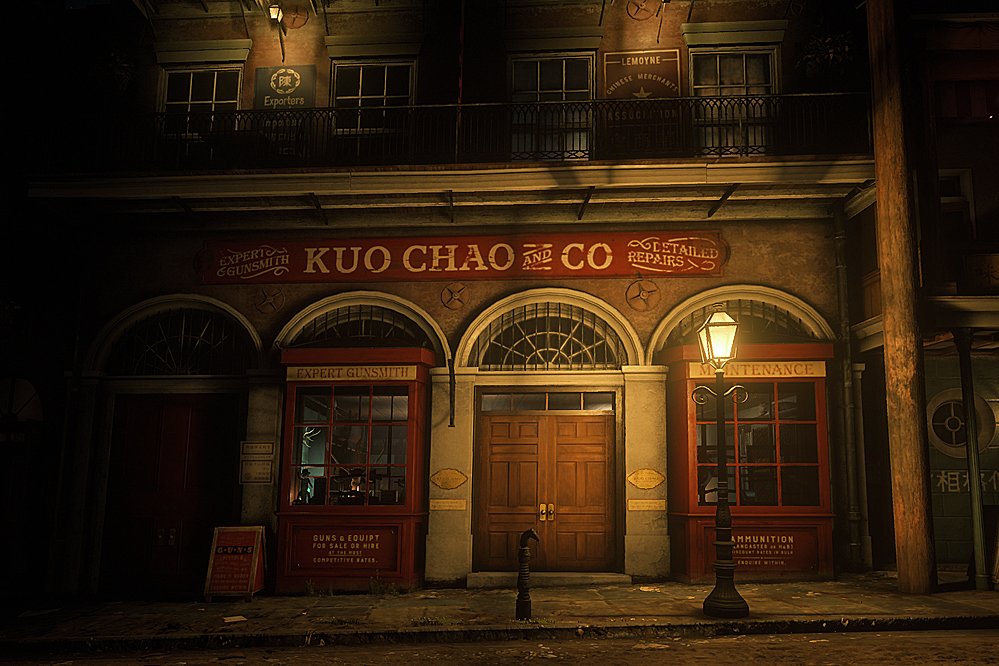• Passende Kleidung könnt ihr bei CHARLES DE COURSEY erwerben. Bleispritzen u. ä. gibt es bei der KUO CHAO & CO.. Pferde erhaltet ihr in den THEODORE ECKHART STABLES. Es gibt auch eine Apotheke - die DR. THEODORE SCOTT PHARMACY. Die Praxis von DR. JOSEPH R. BARNES kann ich euch guten Gewissens empfehlen. Die beiden Saloons der Stadt - der BASTILLE SALOON und DOYLE'S TAVERN solltet ihr besser meiden. Es kann dort sehr rau zugehen ...