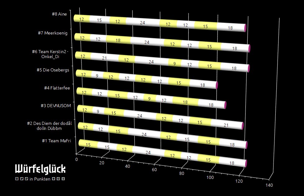 Zeitumstellung! Eine Stunde weniger Schlaf = die Start-№ 1 - DEVNUSOM - hatte es eilig. Eigentlich ... Zunächst eine ⚁! Ungewohnt. "Halvar, Ulme und Snorre", lautete seine Antwort. 3 Glücksfisch-Biskotten. Nanu! Eine ⚀! Das Düll gegen die Gfraster: Keiner kann gewinnen! 3 Glücksfisch-Biskotten für DEVNUSOM. Wieder eine ⚀. Er goss einen Bleiadler und sie eine erfolgreiche Zukunft voraus. Wie, schon wieder eine ⚀? Von Föd V ging's auf Föd VI - Antlers Brief! Weitere 6 Glücksfisch-Biskotten. Würfeltechnisch nicht so ganz der Hit, aber immerhin 21 Glücksfisch-Biskotten für DEVNUSOM!